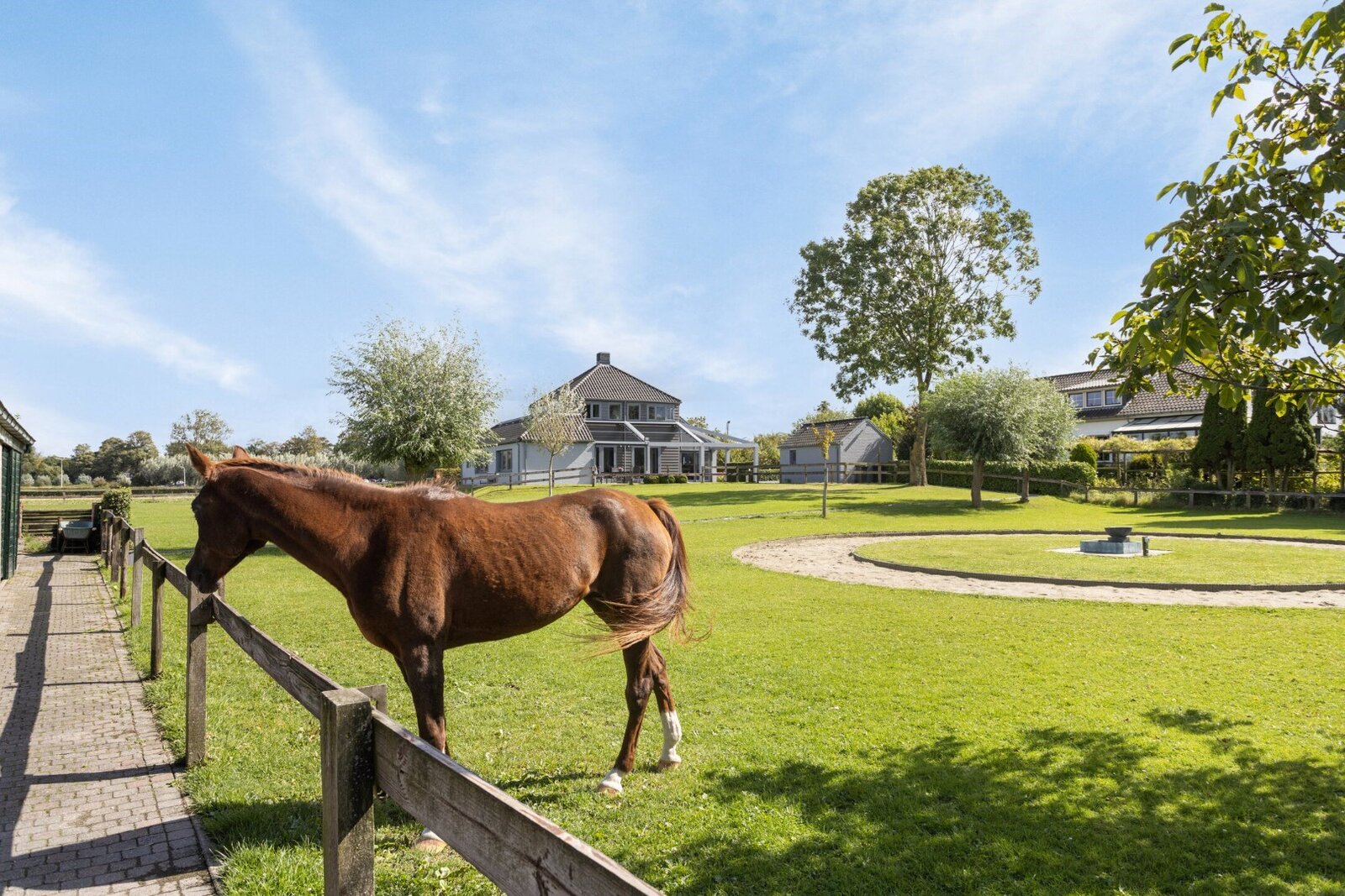 Het riante gazon is voorzien van een houten hekwerk. Als kers op de taart ligt op het perceel een bijgebouw met daaraan twee paardenstallen, een materialenruimte en een hooischuur.