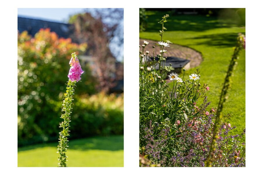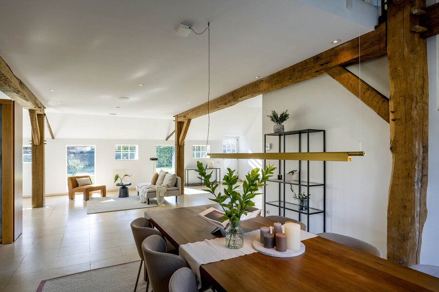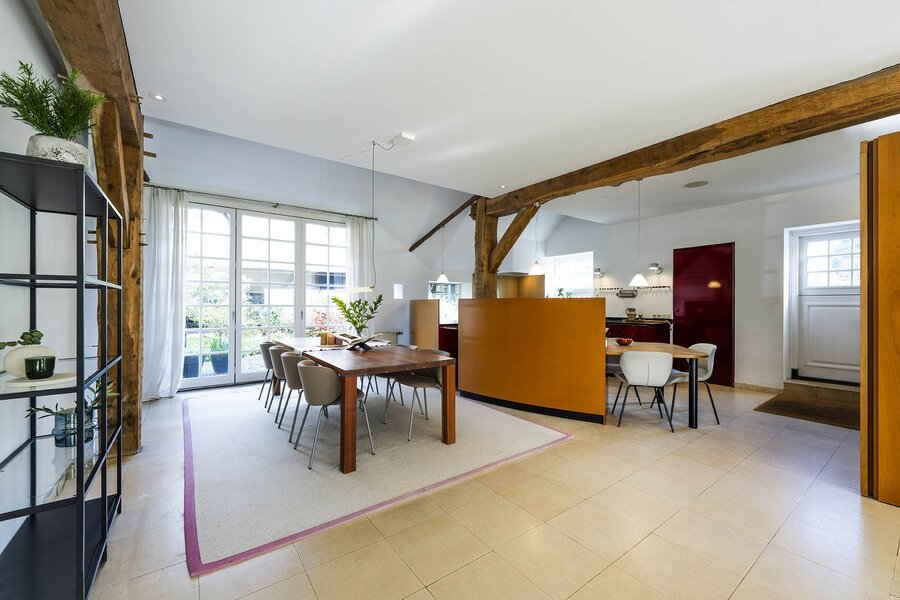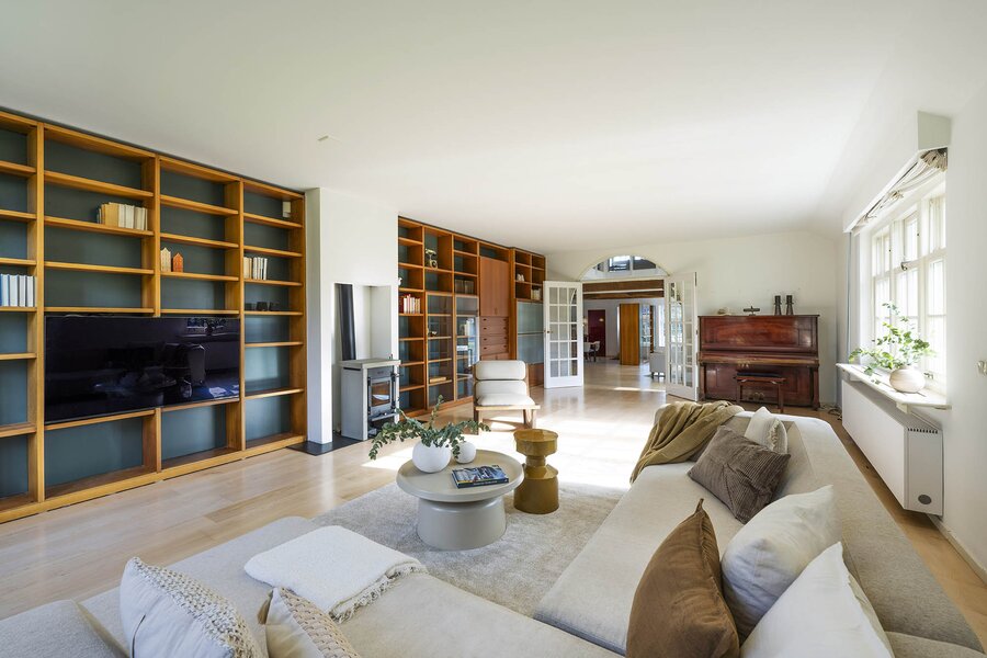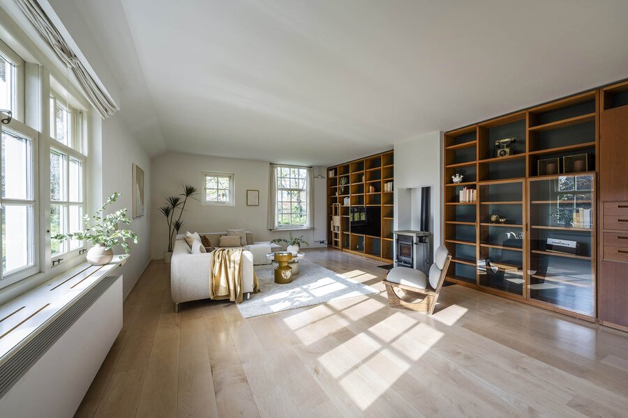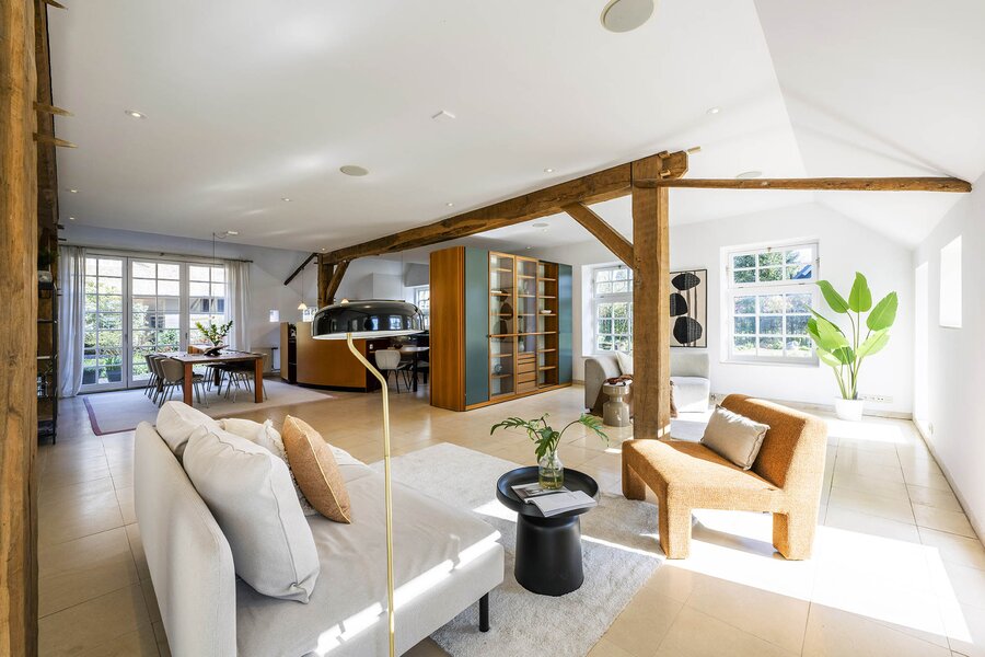 A characterful entrance leads into a spacious hallway with guest toilet. The expansive, light-filled living room includes a work area and adjoins the cozy kitchen with built-in appliances and dining area with French doors to the garden. A charming raised room with wood-burning stove overlooks the garden – ideal as a second lounge, music room or library.