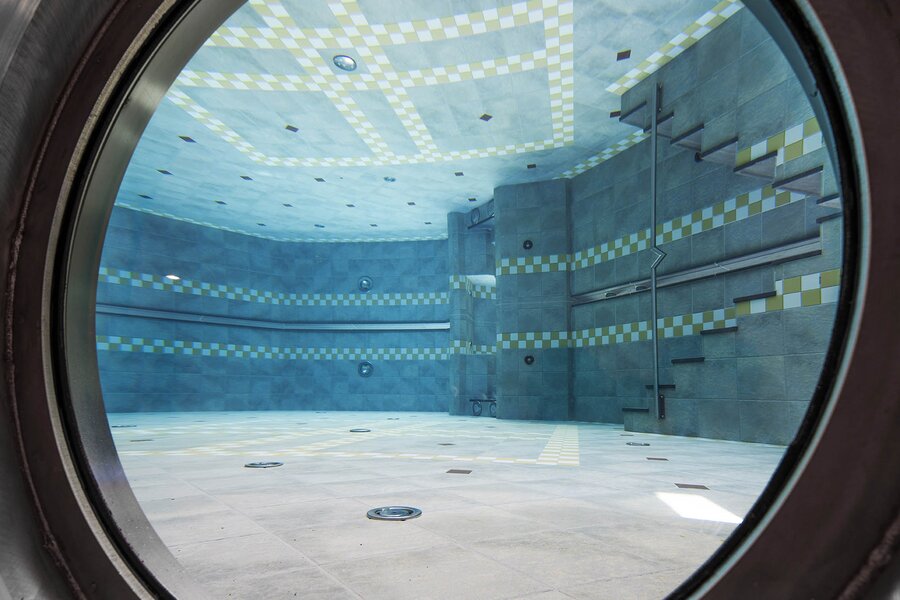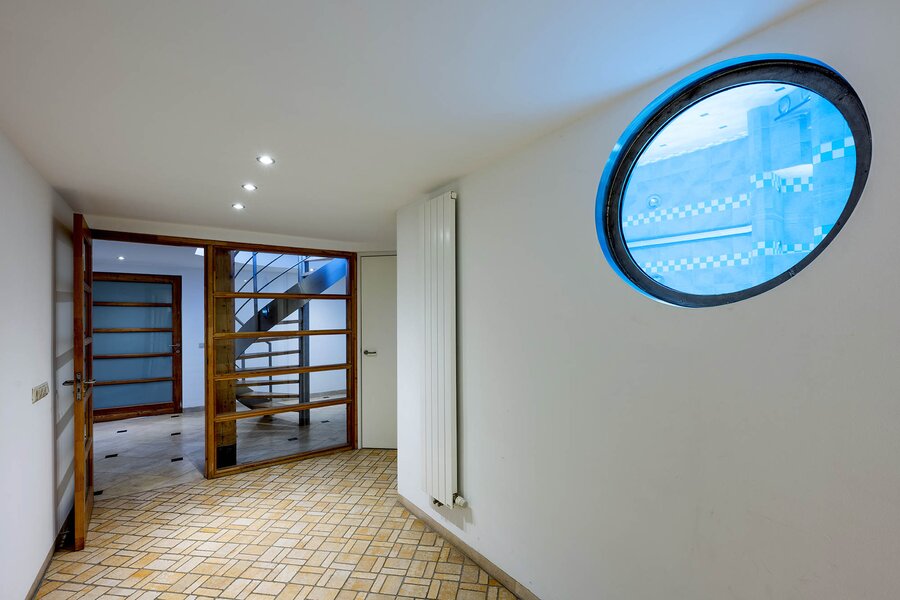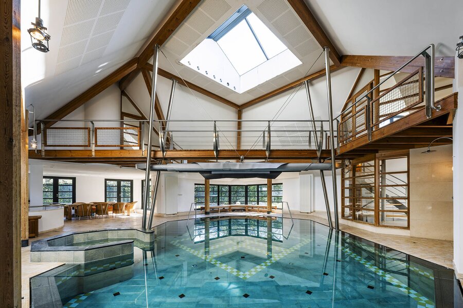 Currently in use as a laundry with pantry, this level also includes a ‘safe room’, a wine cellar with sink, a technical room and adjacent provisions cellar with its own toilet. Moving into the wellness area, you’ll pass striking round windows offering a view "underwater" into the pool. The spa includes a steam room, separate ladies' and men's changing areas with individual showers and sinks, and a second separate toilet. A fixed staircase leads up to the pool on ground level.