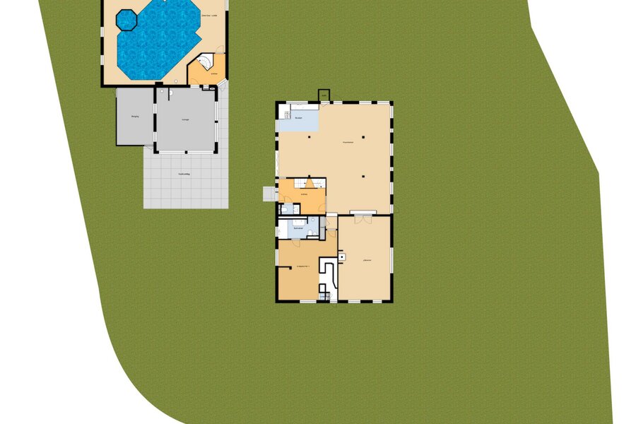 Begane grond: de begane grond heeft een ruime overkapping voor de auto's. Een elektrische garagedeur voor de inpandige garage van ca. 42 m² met een aparte hondendouche en schrobgootsteen. Het zeer ruime zwembad heeft een whirlpool gedeelte en aansluitend een groot zitgedeelte met een eigen pantry. Ook hier heeft men prachtig uitzicht over de tuin. Boven het zwembad is een grote vide met loopbrug naar de gastenkamers. Een imposant geheel. Kosten noch moeite zijn gespaard en het geheel heeft dan ook een zeer luxe uitstraling.