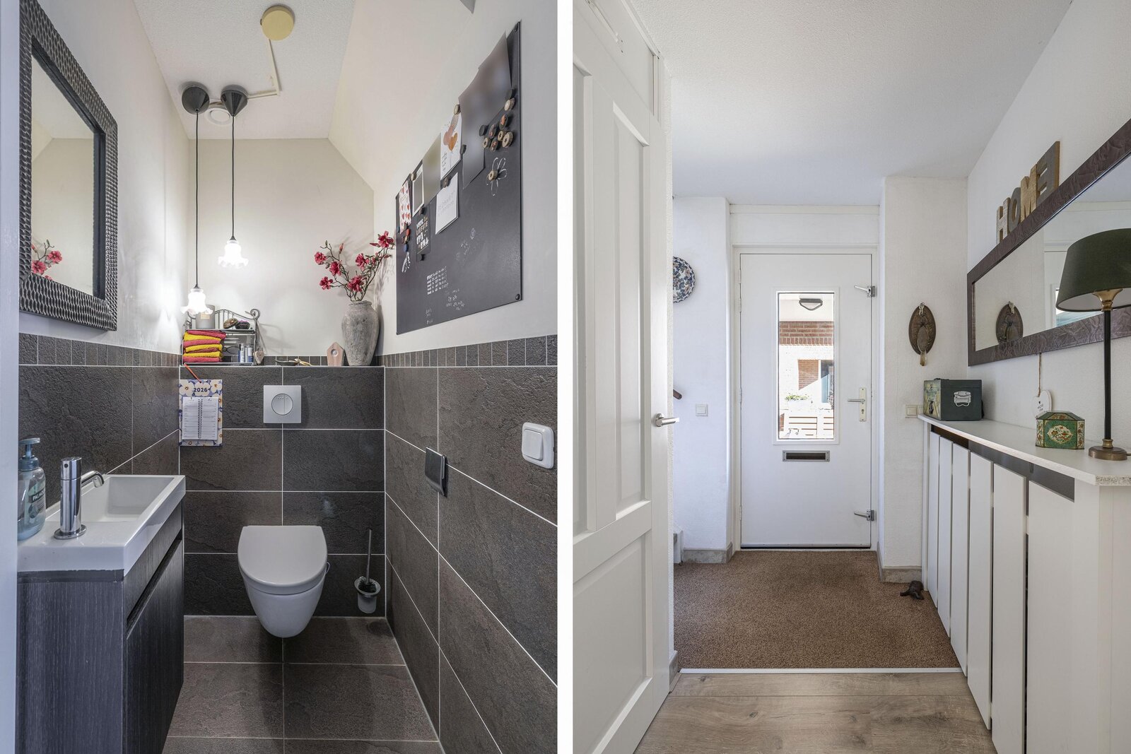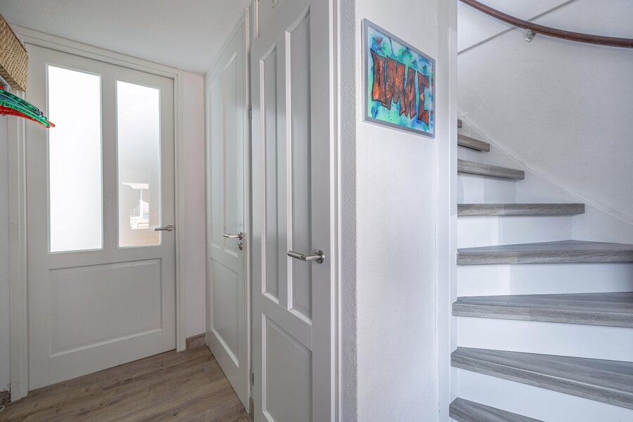 Via de zij-entree komt u binnen in de hal met garderobe, meterkast en een toilet met fonteintje.