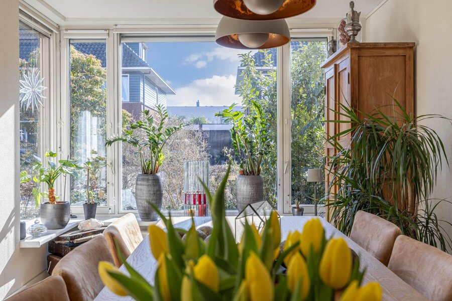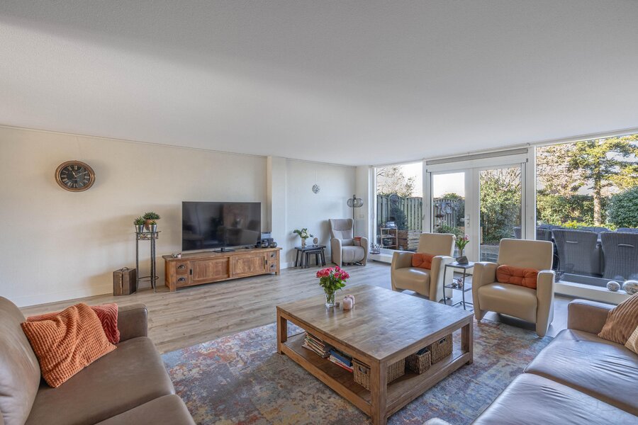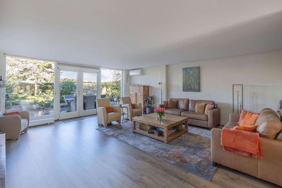 Door de uitbouw aan de achterzijde is een bijzonder ruime woonkamer ontstaan. De zithoek kijkt uit over de tuin en dankzij de openslaande deuren vloeien binnen en buiten hier moeiteloos in elkaar over. De grote raampartijen zorgen de hele dag voor een prettige lichtinval.