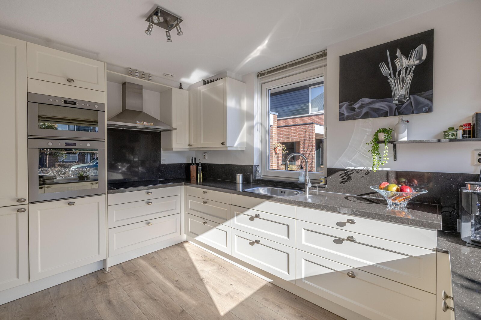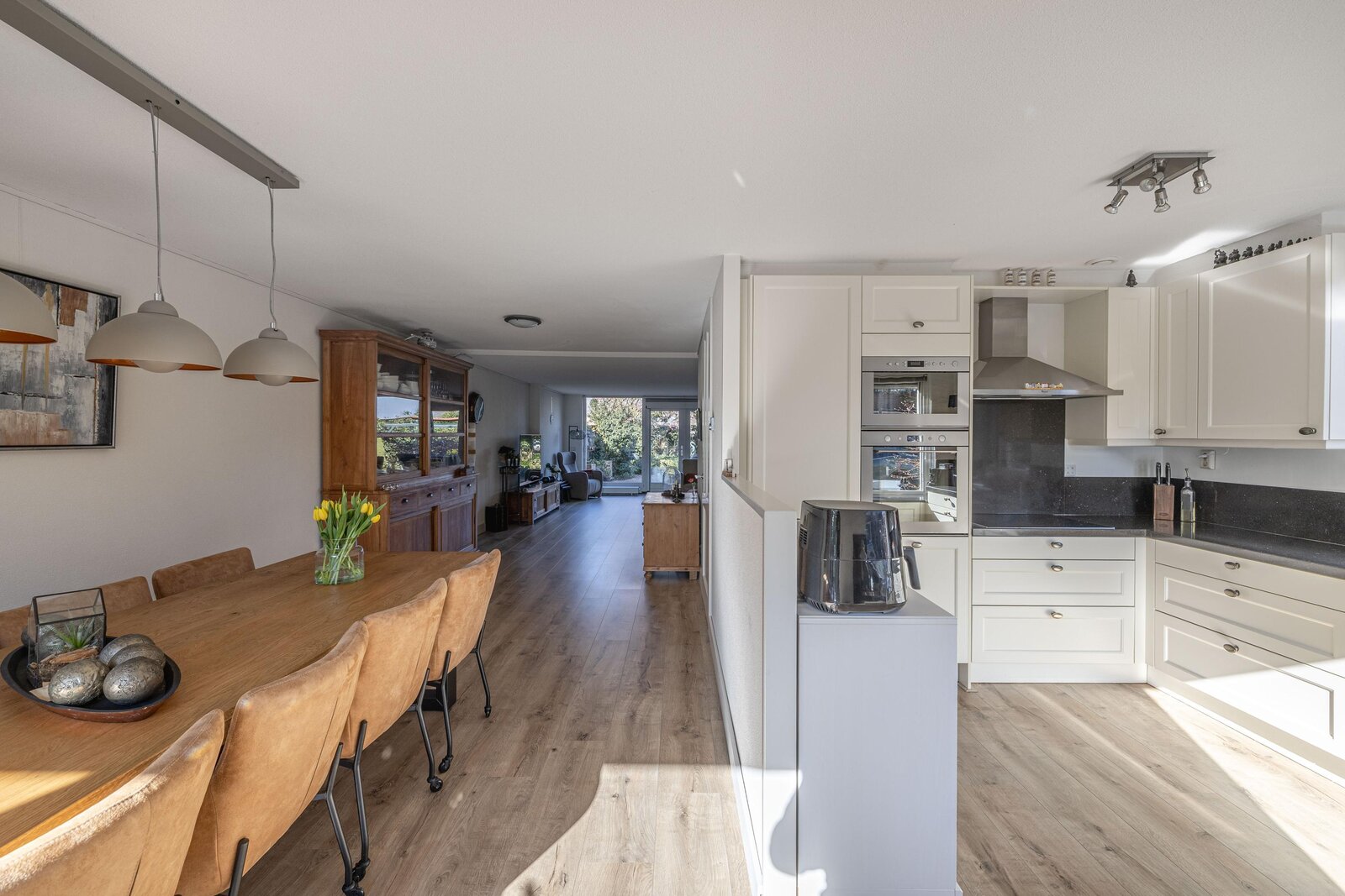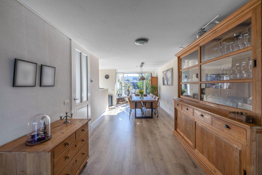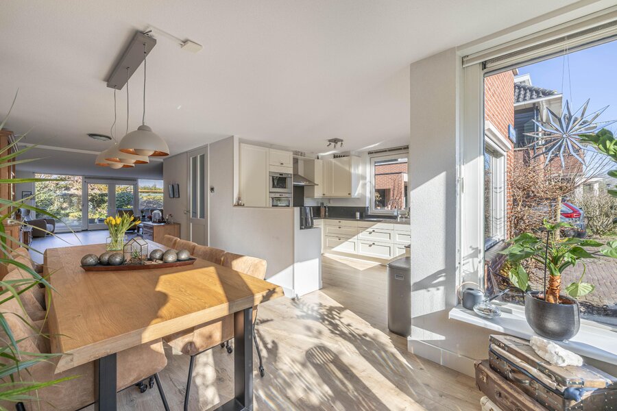 De leefruimte is verrassend groot en strekt zich uit over vrijwel de gehele lengte van de woning. Aan de voorzijde bevindt zich de sfeervolle eetkamer met erker, een heerlijke plek voor lange diners of gezellige familiemomenten. De open keuken is uitgevoerd in een praktische L-opstelling, voorzien van diverse inbouwapparatuur, waaronder een Quooker. Daarnaast is de woning voorzien van een waterontharder, wat bijdraagt aan extra comfort in het dagelijks gebruik.