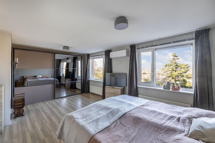 De royale master bedroom bevindt zich aan de achterzijde van de woning, strekt zich uit over de volle breedte en is voorzien van rolluiken.