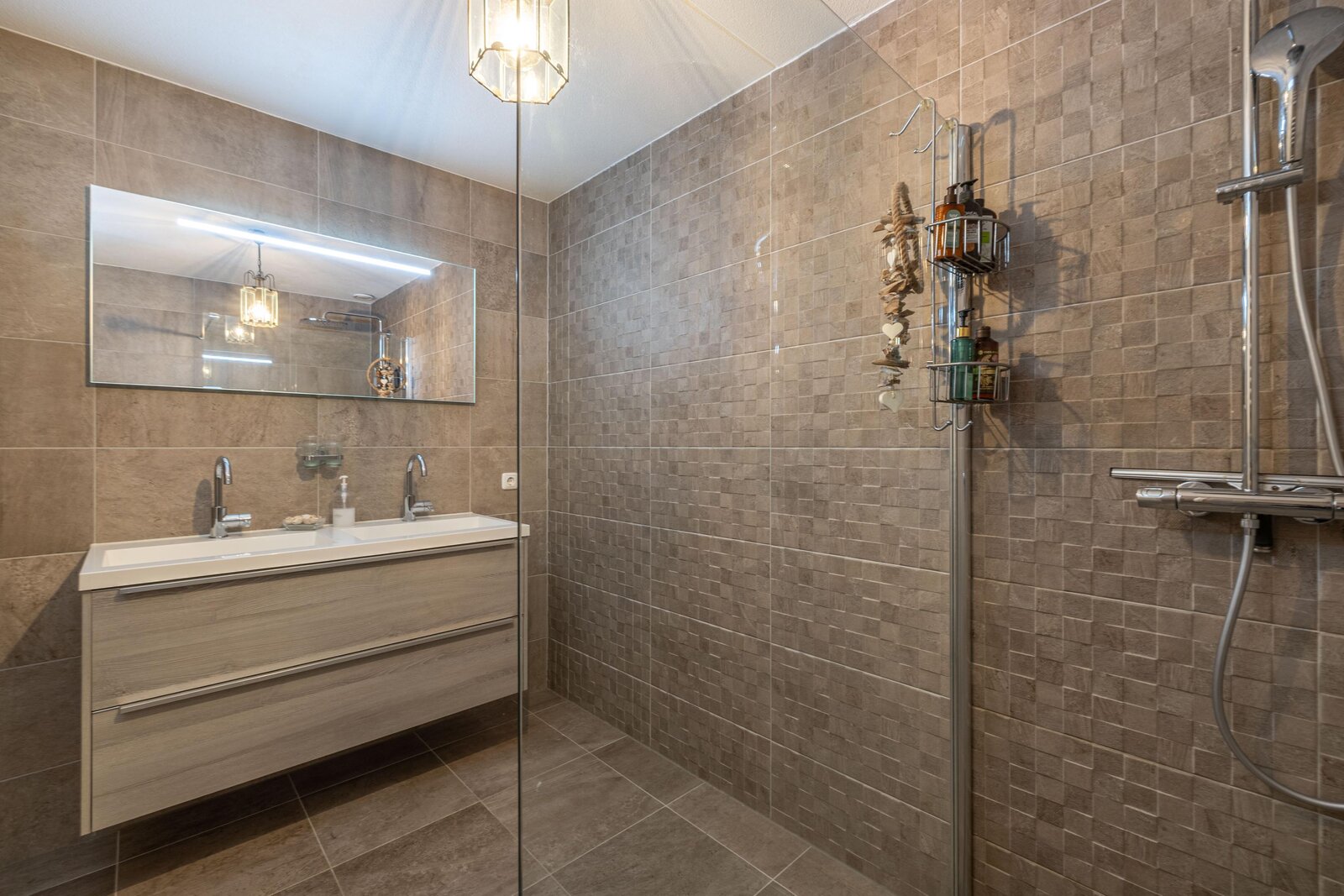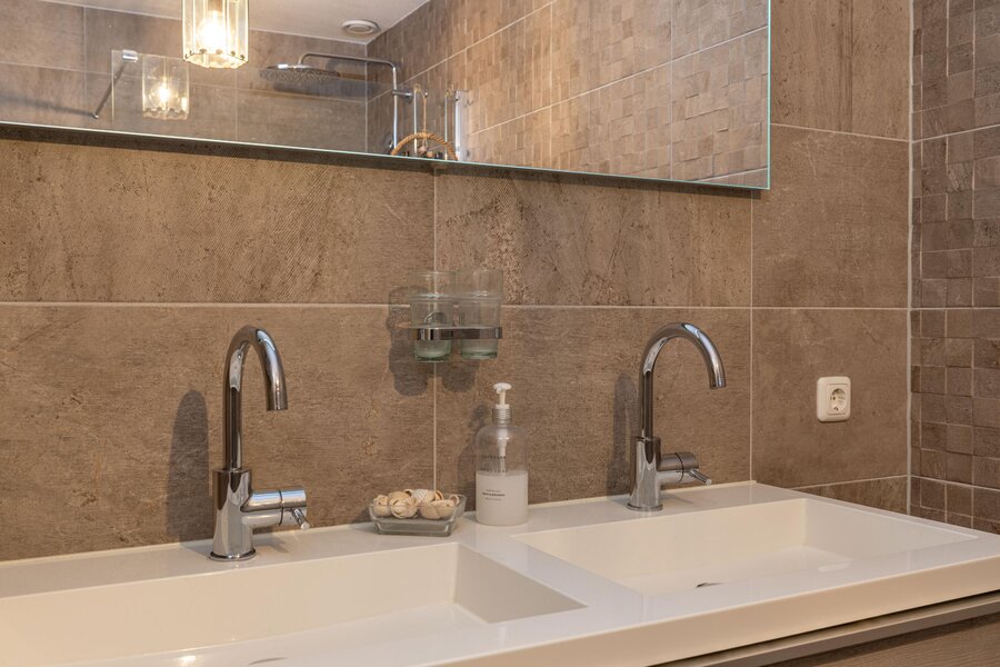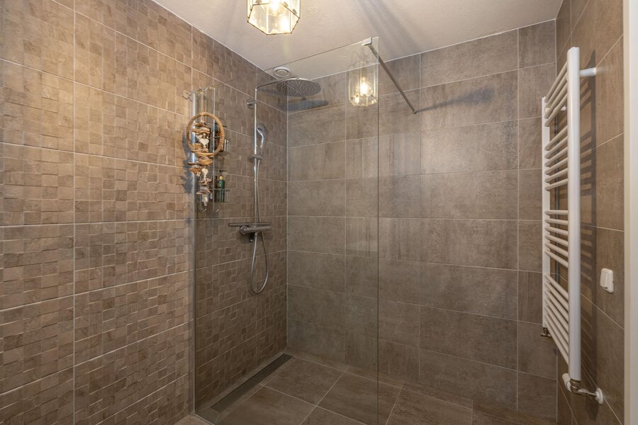 De badkamer is in 2018 vernieuwd en modern uitgevoerd met een ruime inloopdouche, dubbele wastafel en elektrische vloerverwarming. Daarnaast is er een separaat tweede toilet op de overloop.