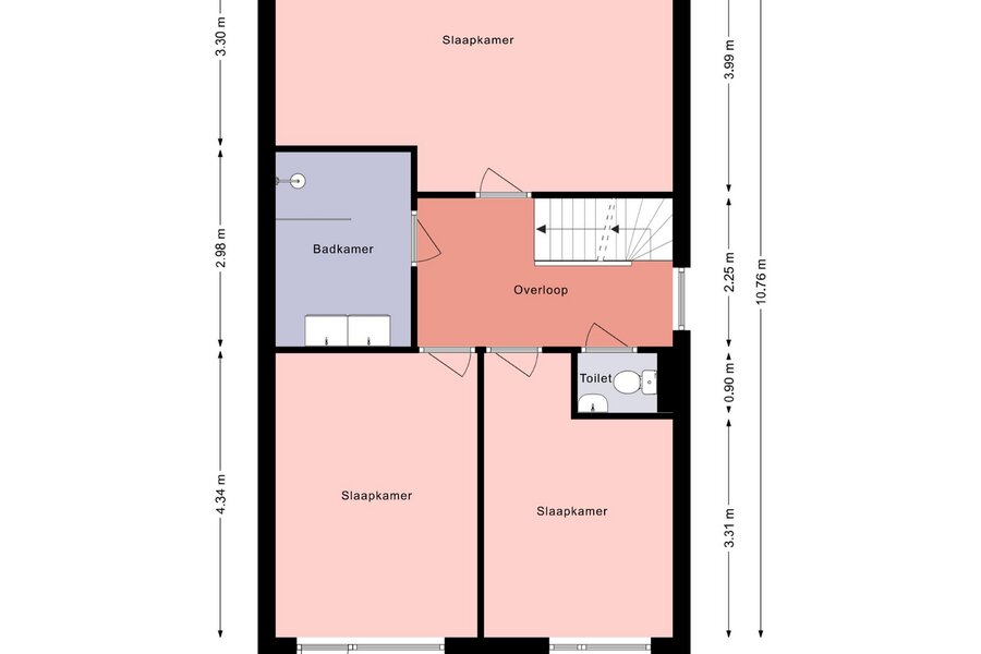 De overloop geeft toegang tot drie ruime slaapkamers, ideaal voor een gezin of voor het combineren van wonen en werken.
