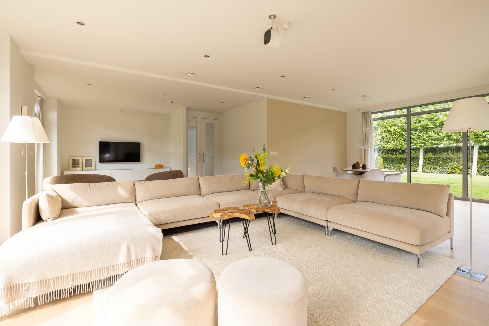 Een ruime woonkamer waar de buitenruimte een vanzelfsprekend verlengstuk vormt van het interieur