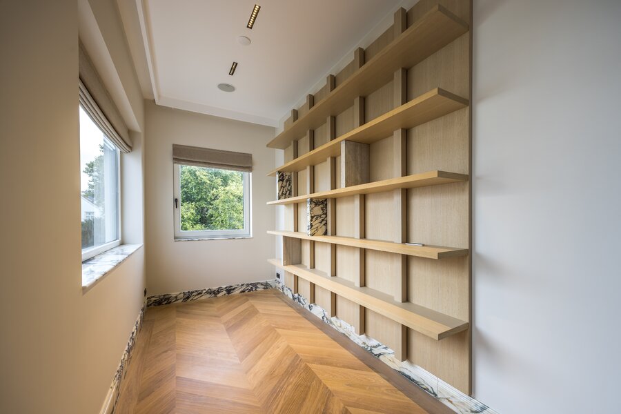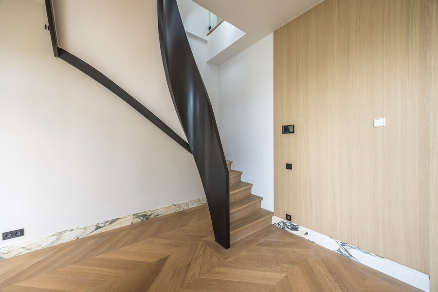 Apartment 7-C is an impressive duplex penthouse spanning the second and third floors, with a living area of approximately 120 m². The first level features a generous living space with an open kitchen, where tall windows and French doors fill the rooms with natural light. The modern kitchen is equipped with top-of-the-line appliances, making it perfect for both everyday meals and elegant entertaining. The kitchen also provides direct access to the balcony.