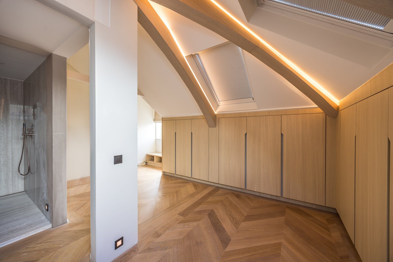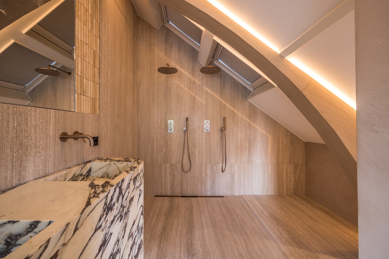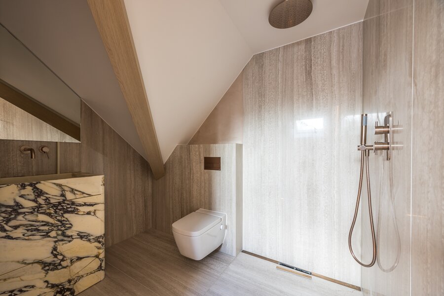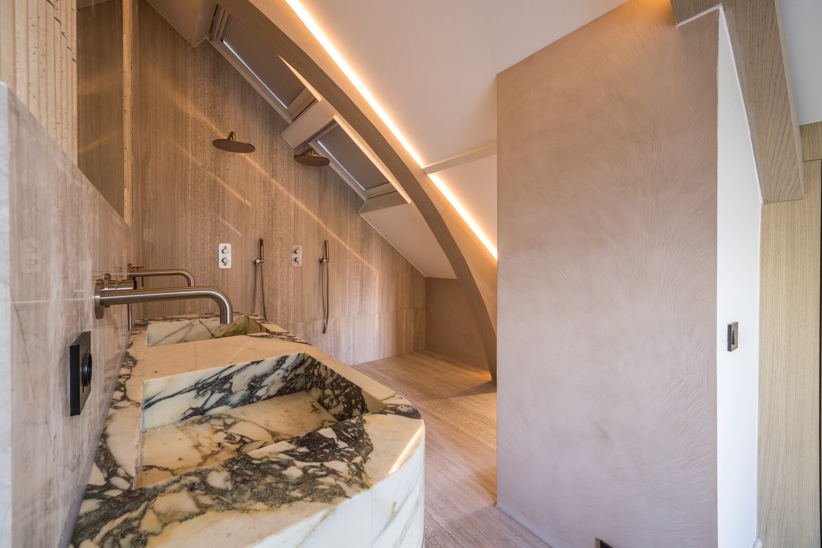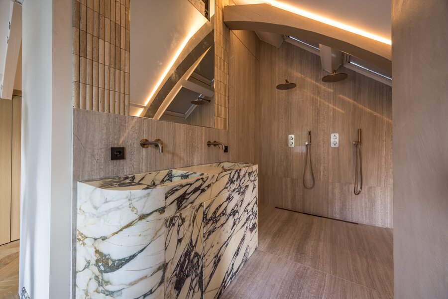 Een verdieping hoger bevinden zich twee ruime slaapkamers. De master bedroom beschikt over een en-suite badkamer met inloopdouche en dubbele wastafel. Daarnaast is er een tweede, eveneens luxe afgewerkte badkamer voor de overige slaapkamer. Beide badkamers ademen dezelfde verfijning als de rest van het appartement.