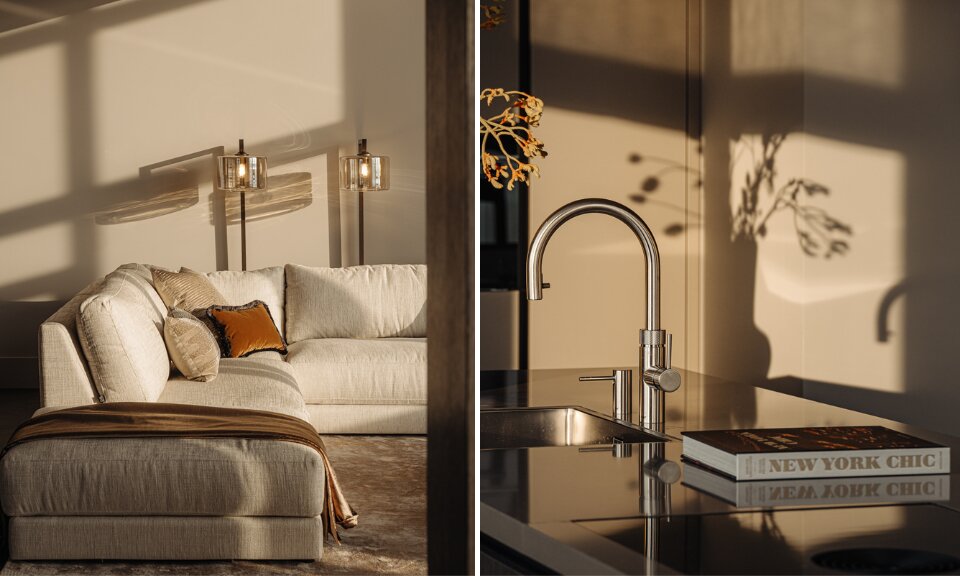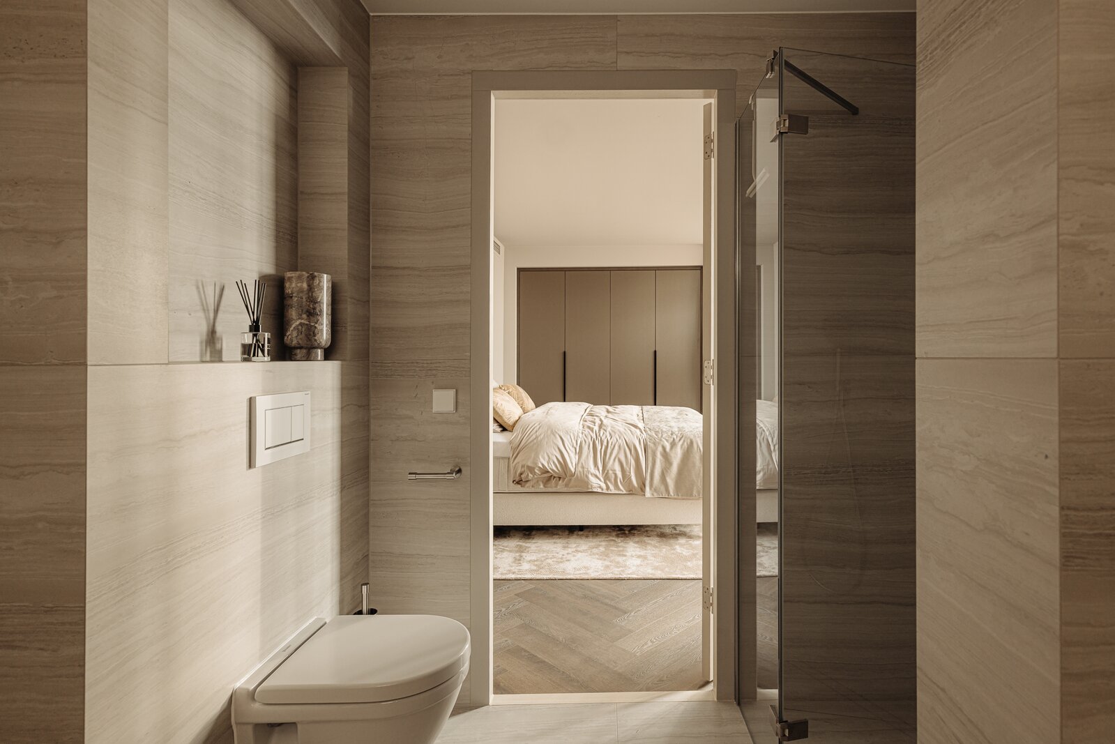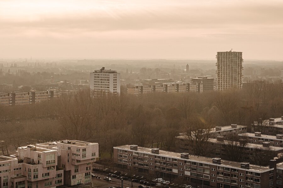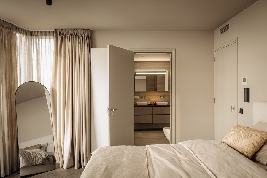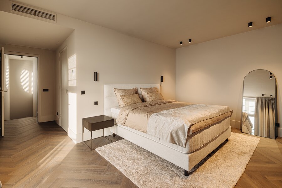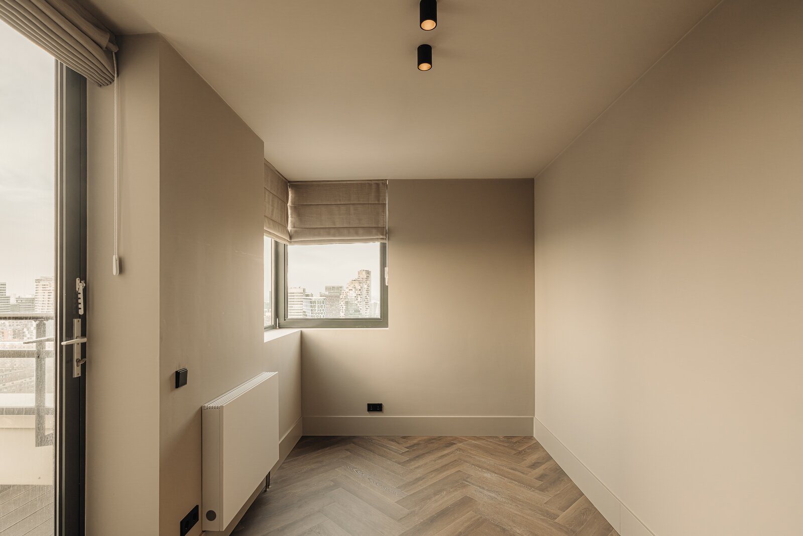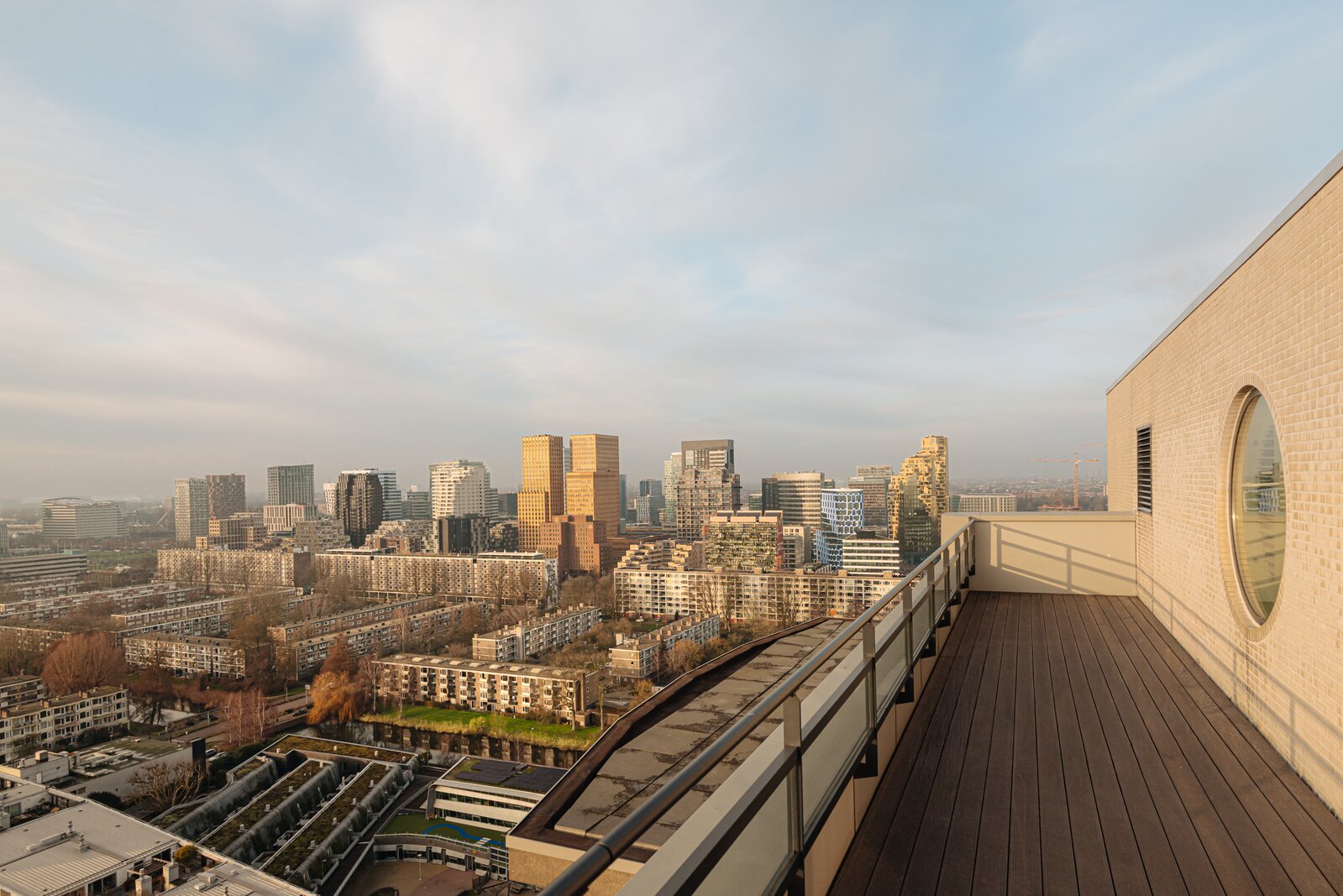 The apartment features three bedrooms, two bathrooms, and an open-plan living kitchen with a central island. The spacious living area, with ceiling heights up to 5.5 meters, is bright and airy, opening onto a west-facing terrace ideal for afternoon and evening sun. From the apartment, you can enjoy panoramic views over Schiphol, the Zuidas, and the city of Amsterdam. The residence is accessible via a private elevator, ensuring maximum privacy and convenience.