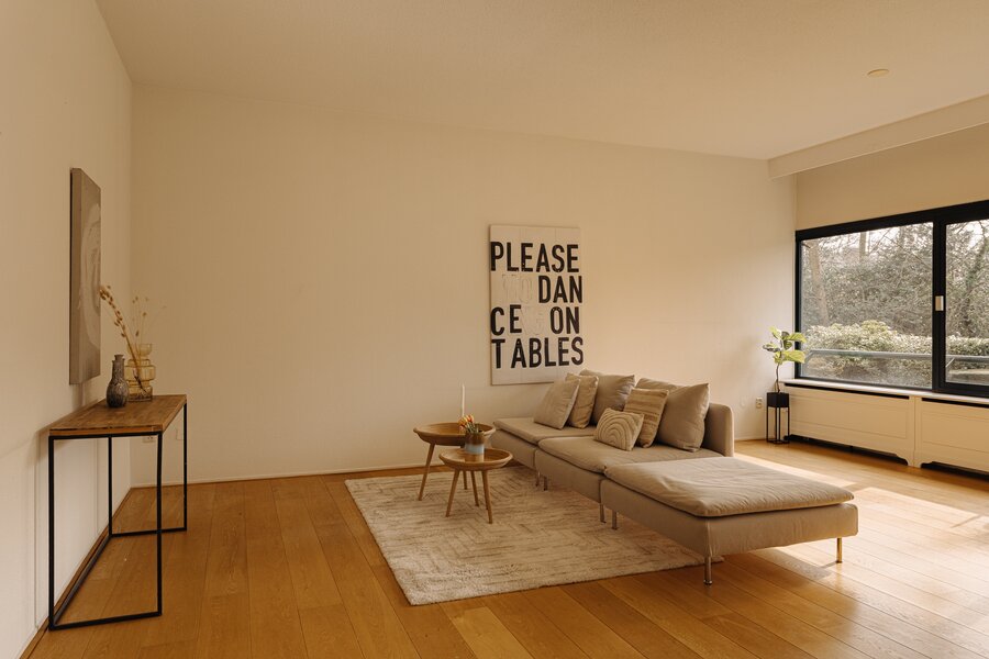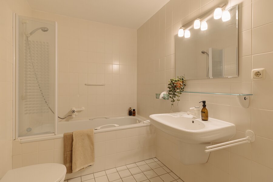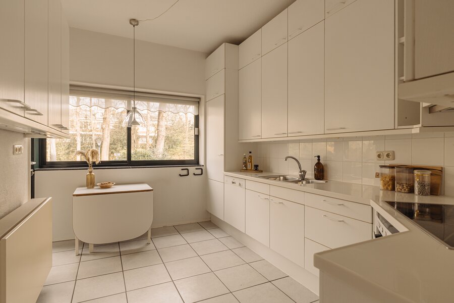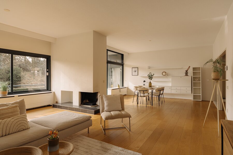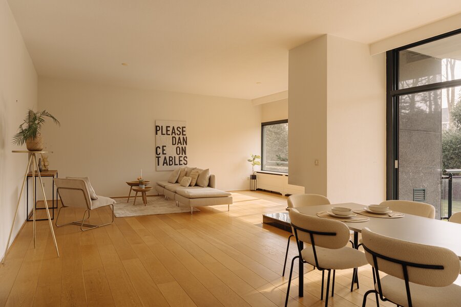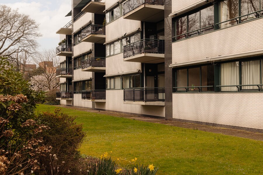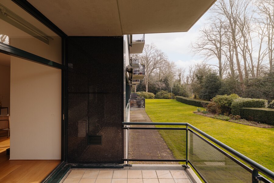 De verzorgde centrale entree met lift en afgesloten hal vormt een stijlvol welkom. Binnenkomst in het appartement via een royale ontvangsthal met garderobe en gastentoilet. De indrukwekkende woonkamer strekt zich uit over de volle breedte en wordt gekenmerkt door grote raampartijen en een prettige lichtinval. De schuifpui biedt toegang tot het zonnige terras met uitzicht op de groene binnentuin, een heerlijke plek om in alle privacy te genieten. De keuken is praktisch en verzorgd uitgevoerd en voorzien van diverse inbouwapparatuur, met directe toegang tot het balkon.