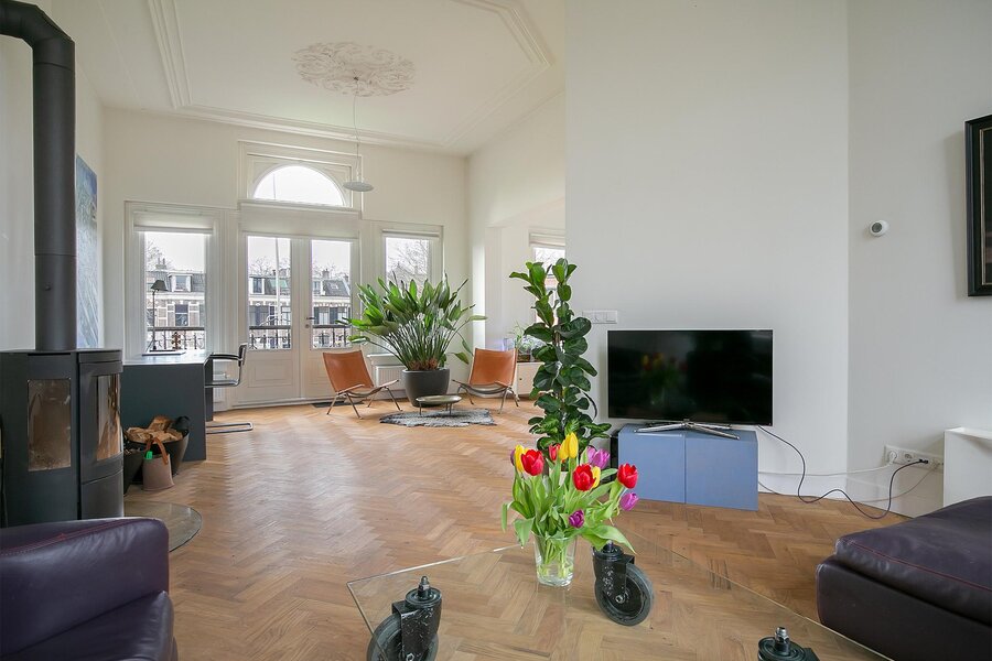 De ruime en lichte woonkamer met visgraat parket en een houtkachel bevindt zich op de eerste verdieping van het gerenoveerde gedeelte. Aan de voorzijde geven openslaande deuren toegang naar het balkon waar in de middag en de avond heerlijk van de zon en de avondluchten kan worden genoten. In de uitbouw bevindt zich de royale open keuken. Deze heeft een klein balkon waar men heerlijk in de ochtendzon kan ontbijten. Een wenteltrap geeft toegang tot het dakterras met een vrij uitzicht rondom en voldoende ruimte voor bijvoorbeeld een lounge set.