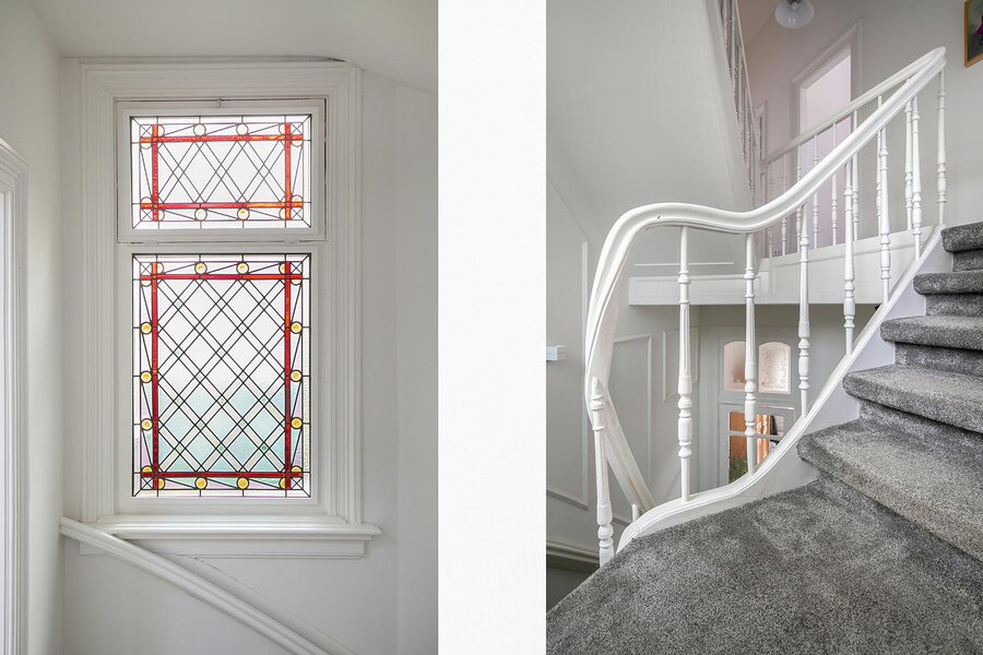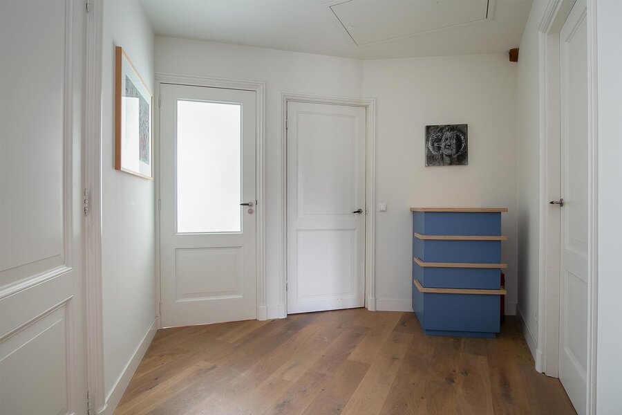 Ruime entree met een hal voorzien van glas in lood ramen en toegang naar het stijlvolle trappenhuis en de garderobe. Er is hier ook voldoende ruimte voor het plaatsen van bijv. fietsen. Tevens bevindt zich hier de meterkast.