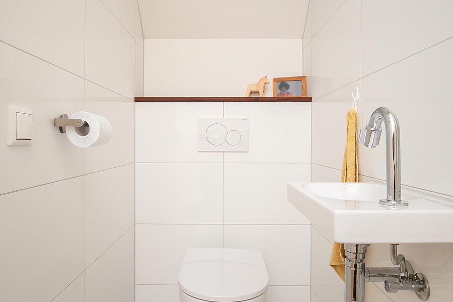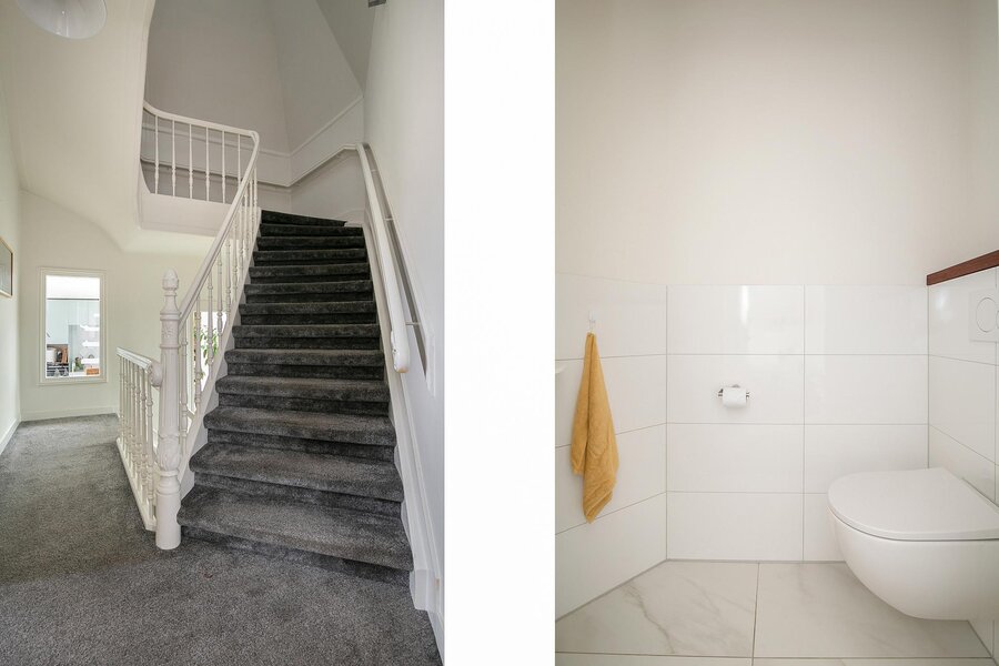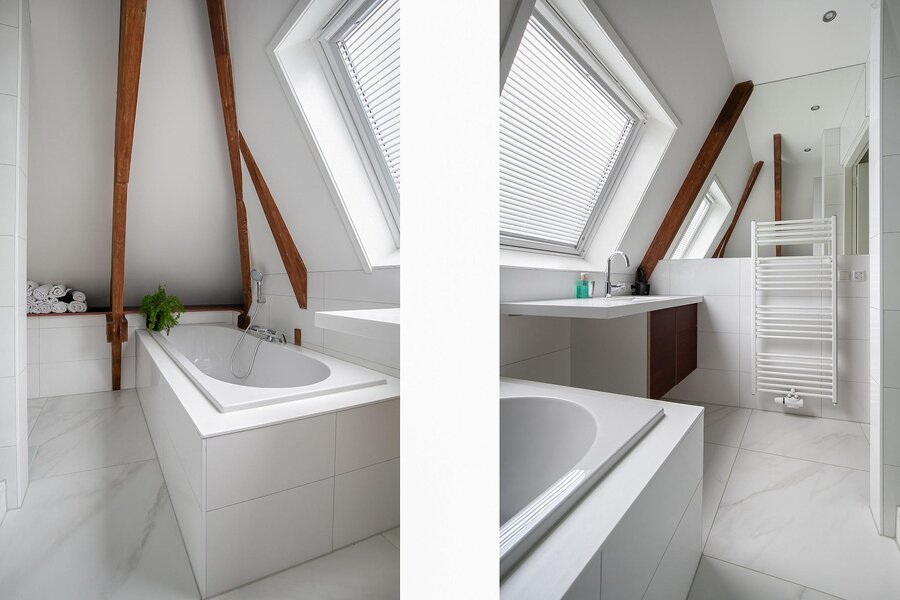Overloop met toegang tot de tweede en de derde slaapkamer, een tweede toilet en de badkamer. Tevens een bergruimte met wasmachine-aansluiting. Vanuit de overloop is er met een vlizo trap toegang tot een ruime vliering. De moderne badkamer is voorzien van douchecabine, ligbad, design radiator en wastafel.