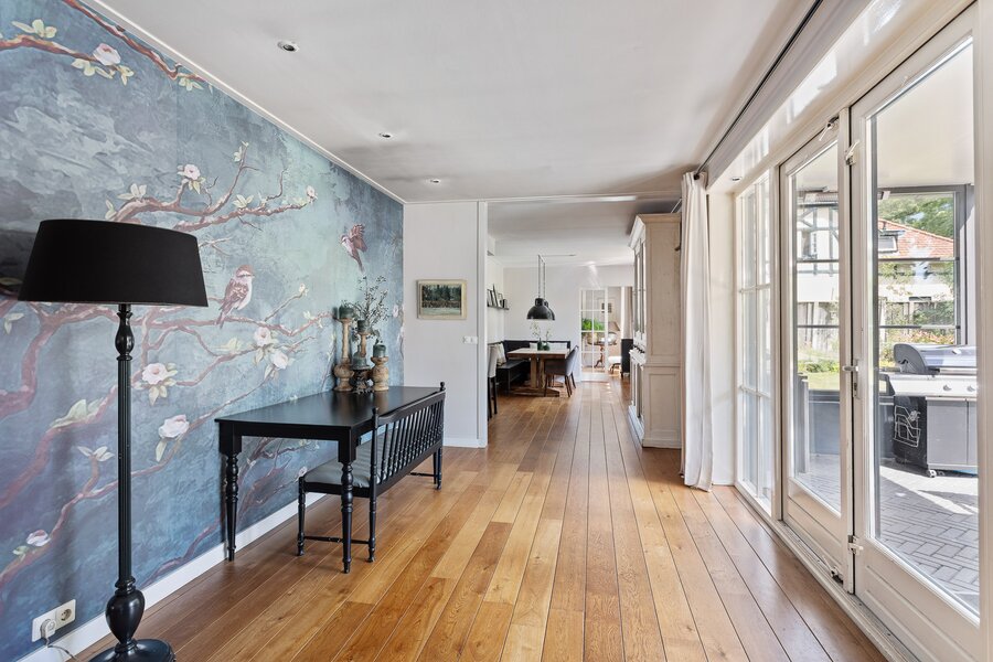 Parkeren? Dat doe je gewoon op je eigen terrein – meer dan genoeg plek voor je eigen auto’s én die van bezoek. Via de overdekte entree stap je binnen en voel je meteen: dit is thuiskomen. De eiken parketvloer geeft karakter, de royale open haard brengt warmte en de strakke wanden en plafonds zorgen voor een frisse, tijdloze basis.