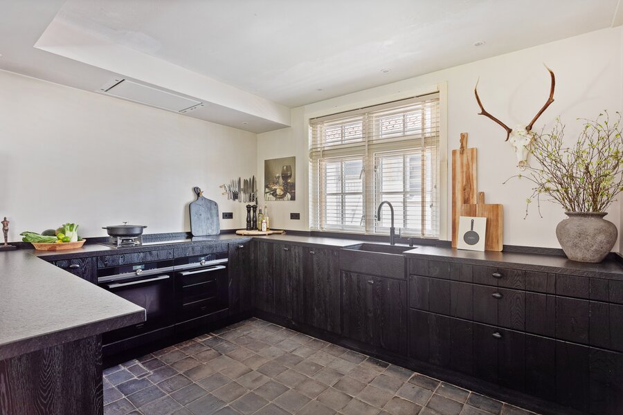 Vanuit de woonkamer loop je door naar een sfeervolle tussenruimte die voelt als een verlengstuk van het huis. Dankzij de openslaande deuren naar de veranda stroomt het licht naar binnen en heb je een directe verbinding met de tuin. Aan de andere kant wacht de woonkeuken. Helemaal in de stijl van het landhuis: de stoere tegelvloer en het donkere keukenmeubel zorgen voor een robuuste uitstraling. En omdat dit een echte Casa di Famiglia is, staat gezellig samenzijn hier centraal: aan het barretje of aan de eettafel.
