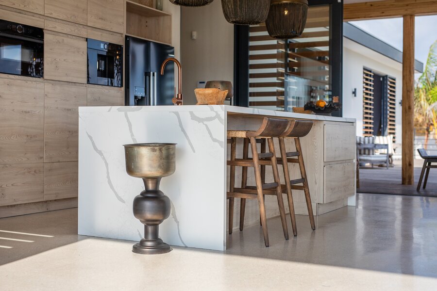 Wat de keuken helemaal tot een unieke plek maakt? Wanneer je door de pannen roert en naar buiten kijkt, heb je het beste zicht op de beroemde Tafelberg. Een klein hapje eten kan gezellig met z’n tweeën aan de bar (met twee krukken) van het kookeiland. Eet je graag uitgebreider buiten? Vanuit de keuken loop je gelijk naar de open veranda.