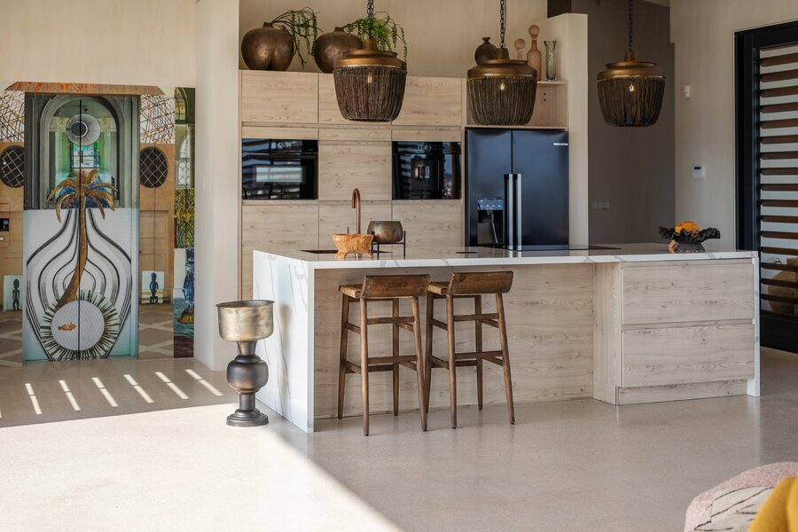 De luxe keuken is van hoogstaande kwaliteit en voorzien van inbouwapparatuur die het comfort verhogen. Zoals twee vaatwassers, twee combi ovens en een robuuste eyecatcher in de vorm van een zwarte Amerikaanse koelkast met ijsdispenser. De keukenapparatuur is verwerkt in een strakke achterwand in hout-look. Het kookeiland is uitgerust met een keramische kookplaat en een ruim werkblad. De ruimte eronder bestaat uit greeploze lades in dezelfde houtlook als de kastenwand, waarin je een flinke voorraad proviand en keukenaccessoires kwijt kunt.