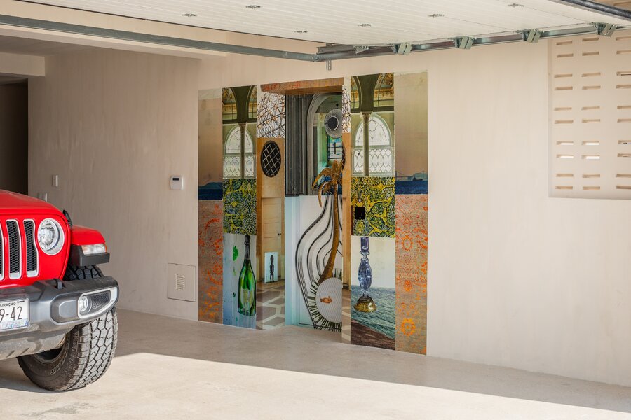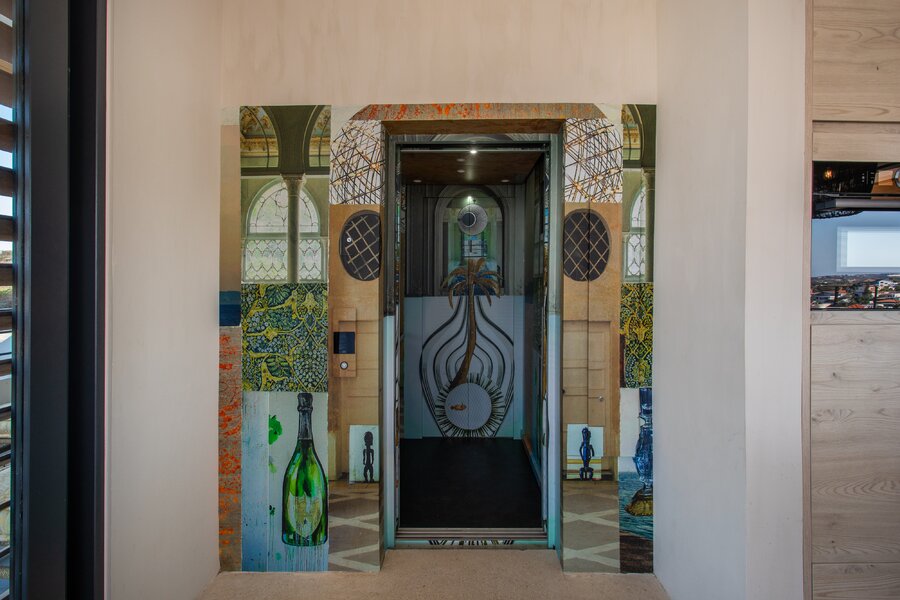 Zoals het een sterrendom betaamt, val je van de ene verbazing in de andere. Dat begint al bij het parkeren van je auto in de garage -met ruimte voor vier auto’s- van waaruit je met een artistiek aangeklede 8-persoonslift naar boven gaat. De lift komt uit in de royale living met comfortabele design meubels en -verlichting en een luxe, open keuken. De ruimte is volledig omgeven door glazen schuifpuien. Naast het vergroten van het ruimtelijke beeld, bieden ze adembenemende, panoramische uitzichten vanuit alle hoeken als optimale bonus. Bovendien is de veranda met verschillende zitjes buiten hierdoor eenvoudig te bereiken.