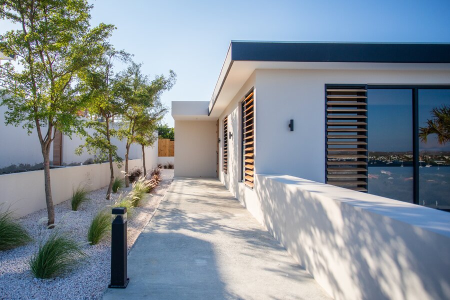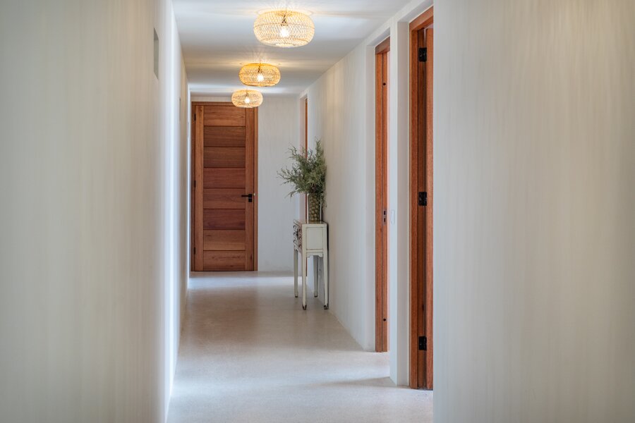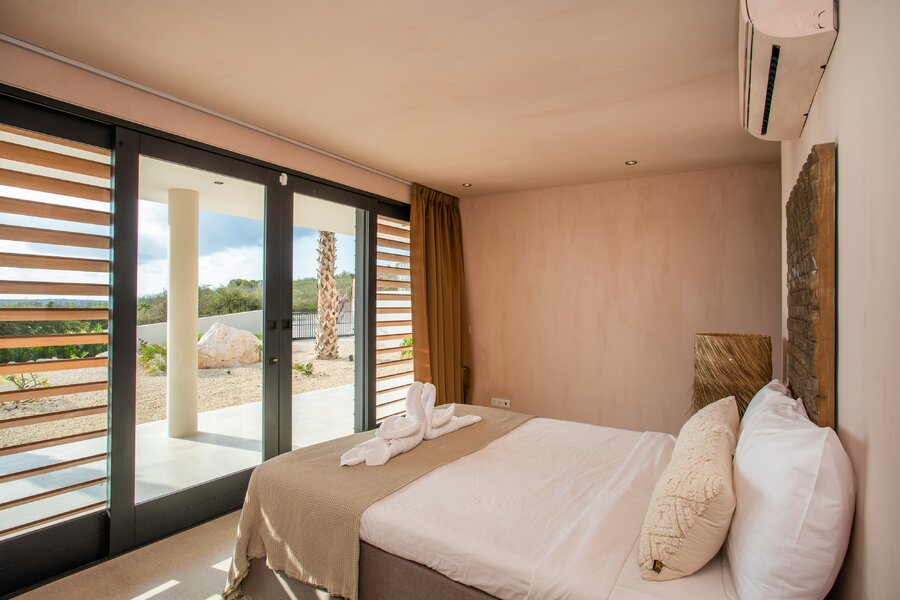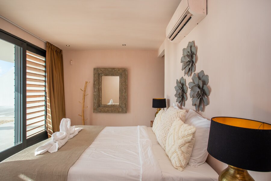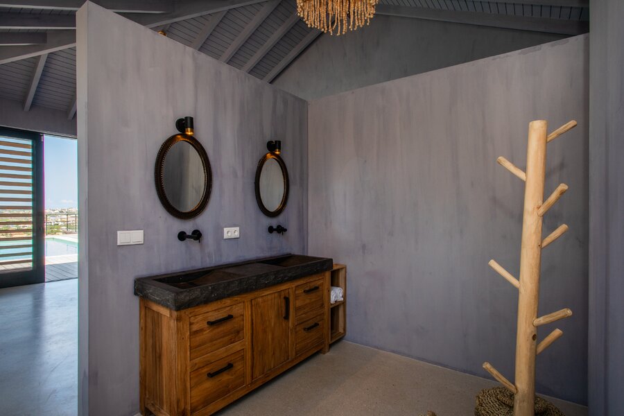 Een ander opvallend detail zijn de wanden en vloeren. Waar veel huizen in Curaçao beschikken over witte wanden, is hier gekozen voor verschillende poedertinten krijtverf. Elke kamer heeft z’n eigen kleur. Om eenheid te behouden zijn de airco’s mee geschilderd. Diezelfde eenheid zie je terug in de beton gestorte vloeren. Middels een relatief nieuwe techniek zijn ze na het storten opgeschuurd waardoor het zand in het beton naar boven komt. De vloeren zijn zo bewerkt dat ze volledig egaal en onderhoudsvriendelijk zijn. Het geheel roept een warm en huiselijk gevoel op.