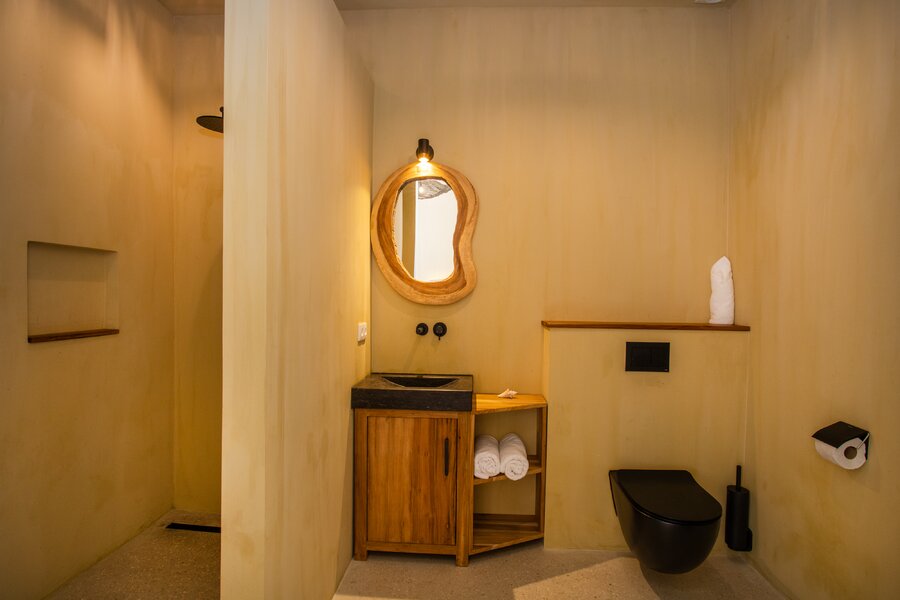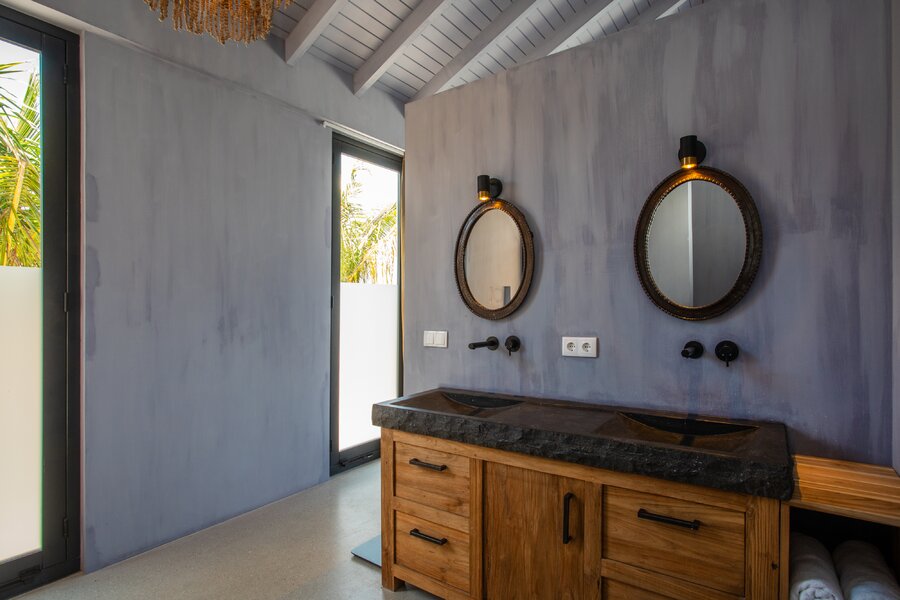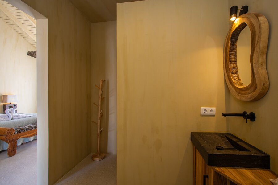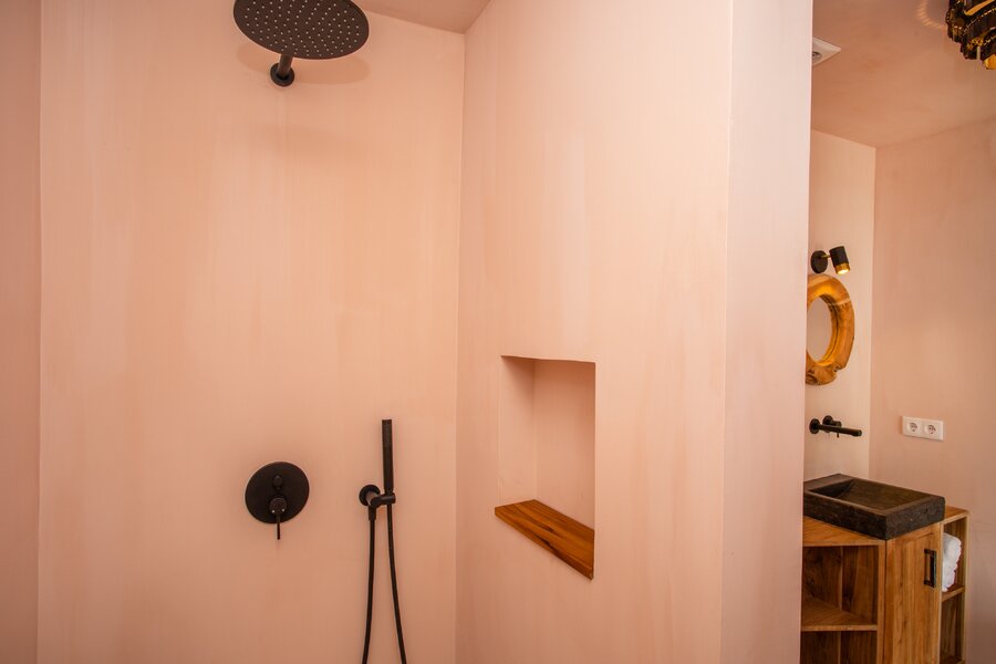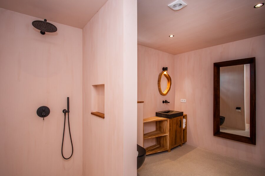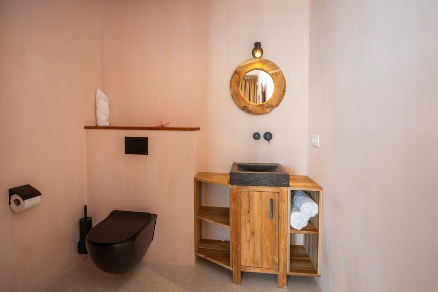In de badkamer trekt een prachtige natuurstenen wastafel met opbergruimte meteen de aandacht. De kranen zijn bevestigd aan de achterwand. De twee spiegels erboven worden beschenen door het licht van spotjes. De douchegelegenheid met ontspannende regendouche, bevindt zich achter een scheidingswand. De tweede master bedroom heeft een geheel eigen ambiance. Ook hier vind je een badkamer en suite, ditmaal in overeenkomende poederkleur met houten accessoires. Deze badkamer heeft een enkele wastafel met spiegel en spot en een vrijhangend toilet.