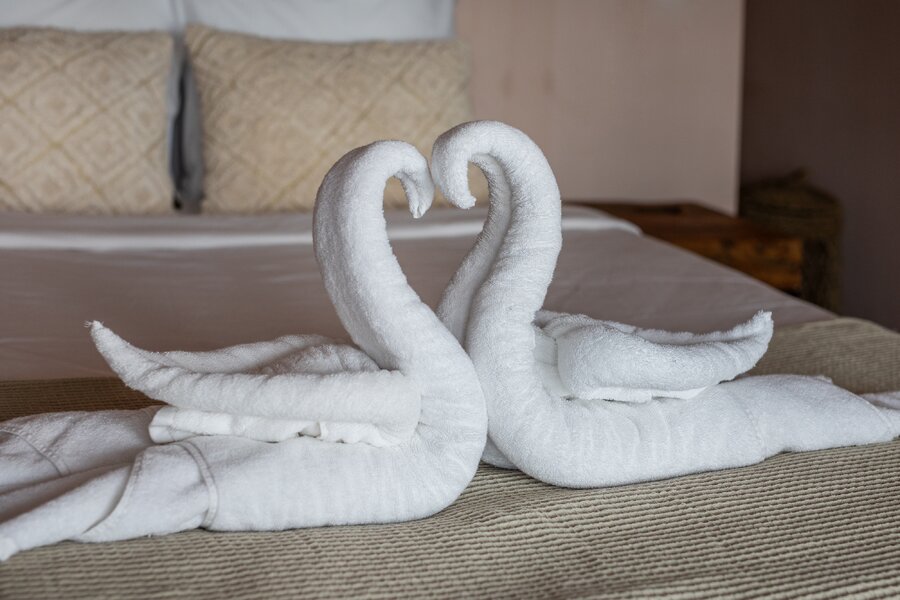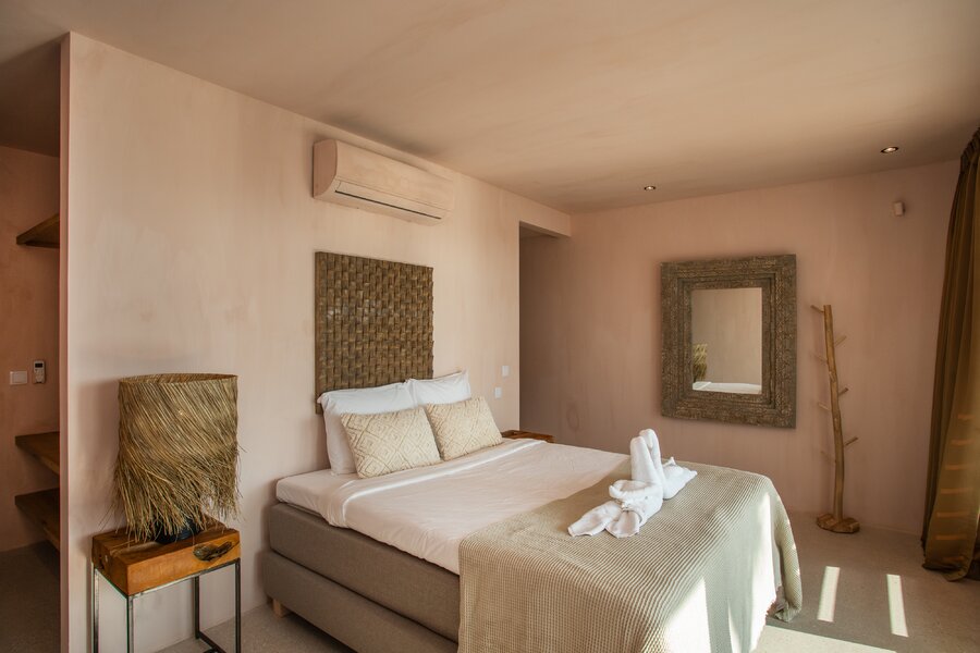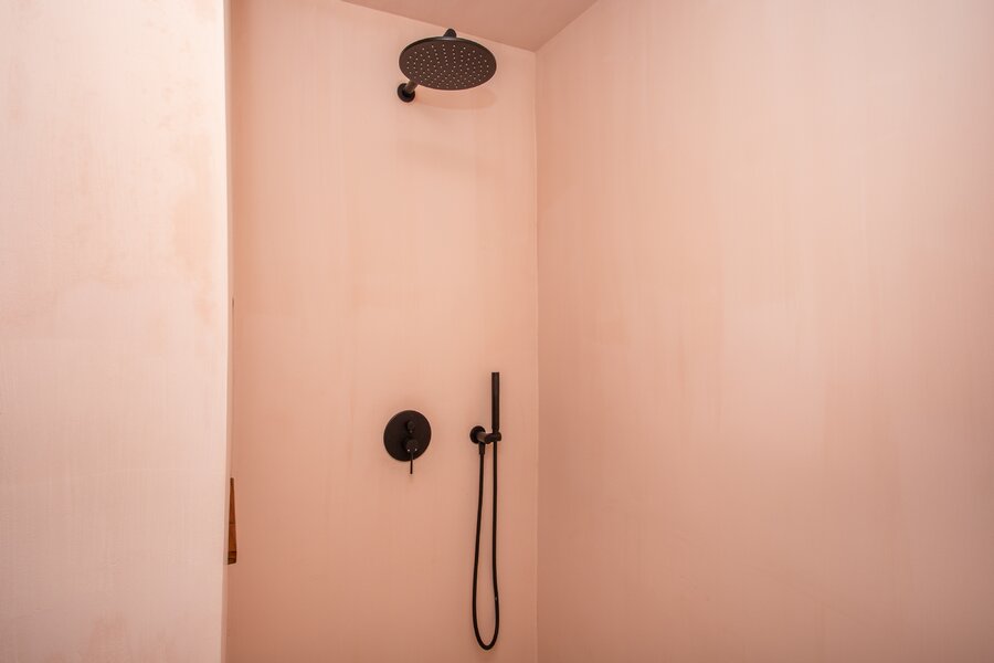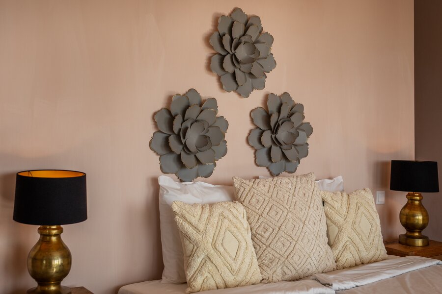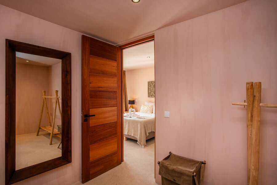 Via de trap bereik je de benedenverdieping waar nog drie slaapkamers te vinden zijn. Uiteraard wordt de trend van poederkleuren en persoonlijke charme in alle drie de kamers doorgetrokken. Ook deze ruimtes beschikken over een tweepersoonsbed, airco en een badkamer en suite. Vanuit de achterste slaapkamer leidt de weg naar buiten via een gangetje waarvan de ruimte praktisch is benut met extra opbergruimte.