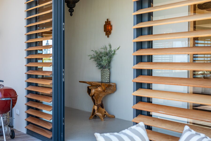 Wanneer je de lift uitstapt, kom je in de ruimtelijke living met open keuken. In de hoek bevindt zich een hangplant als eyecatcher. Want vrijheid en ruimte slaan ook hier de klok. Ongeacht waar je je bevindt in de living of de keuken, overal bieden glazen schuifpuien met shutters direct toegang tot de open veranda. Bovendien vergroten de glazen puien het ruimtelijke gevoel nog ’s extra dankzij adembenemende, panoramische uitzichten vanuit alle hoeken.