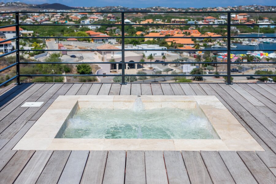 Gezellig bubbelen kan in het champagne bad. Dit bad is uitgerust met een ingebouwd bankje en vier krukken, vervaardigd van betonnen palen welke volledig mee betegeld zijn. Met de armen over de badrand, gaan relaxen en genieten van het uitzicht hand in hand. Een jacuzzi maakt het zwembadkwartet compleet. Vanuit hier kijk je uit over de jachthaven waar privéjachten, zeilboten maar ook cruiseschepen aanmeren en vertrekken. Een rustgevende view op een plek vol reuring.