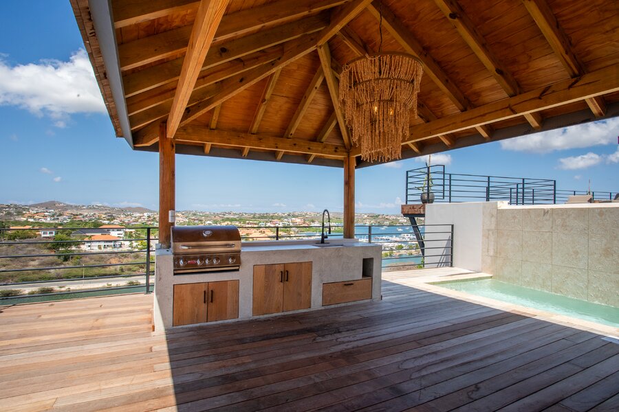De buitenruimte beneden is de plek waar het zalig vertoeven is onder de palapa. Koken kan er in de riante buitenkeuken. De basis is van beton met naturel houten ‘aanrechtdeurtjes’. De buitenkeuken beschikt over een barbecue en een gootsteen met kraan. Tot in de late uurtjes kun je onder de palapa met fijn gezelschap verblijven aan de grote eettafel. Zodra de dag overgaat in de avond verandert het uitzicht in een magisch verlicht tafereel. Zet de tijd stil en laat je verrassen!