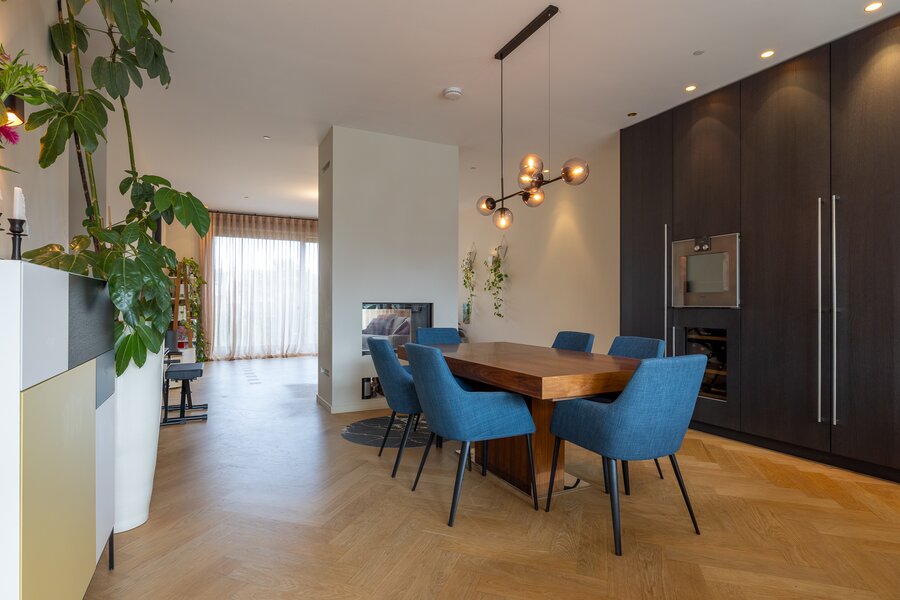 Landing, toilet with handbasin, large living room with ceilings with a height of 3m. The living room has large windows on both front and back side which allows an entry of a lot of natural light. The living space consists of a sitting and a dining area separated by a fire place. The modern and luxurious kitchen is tailor made and consists of various appliances of the brand Gaggenau. The living room has a large sliding door with French balcony and view over the common garden.