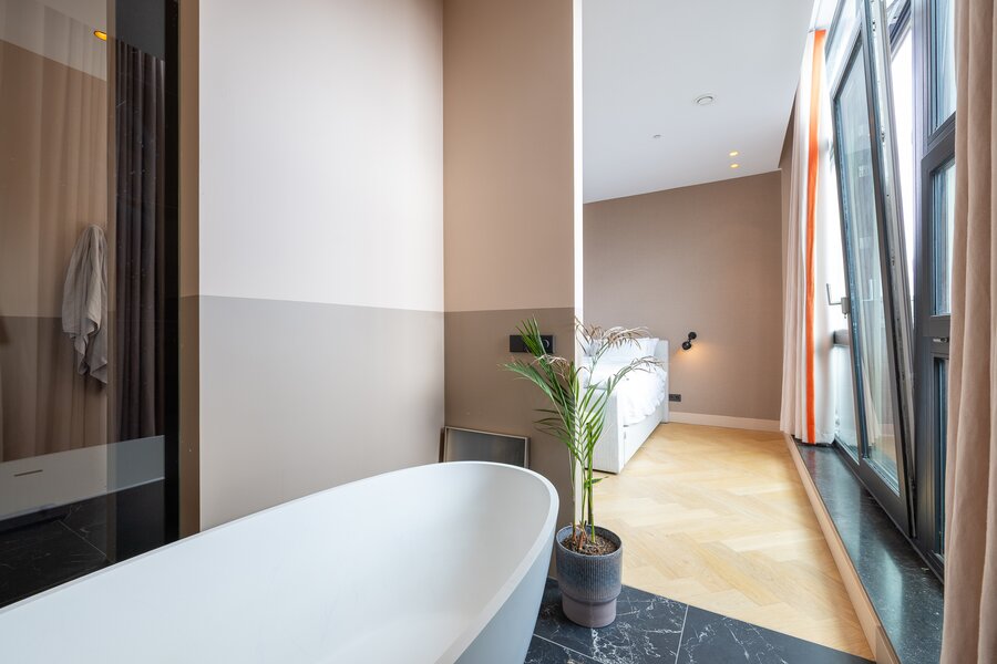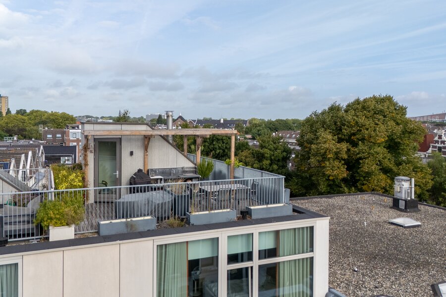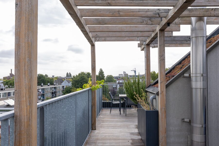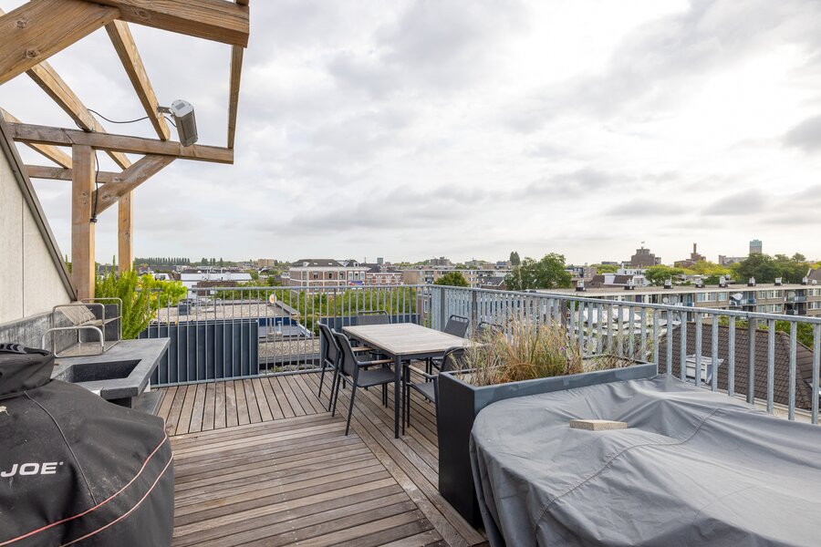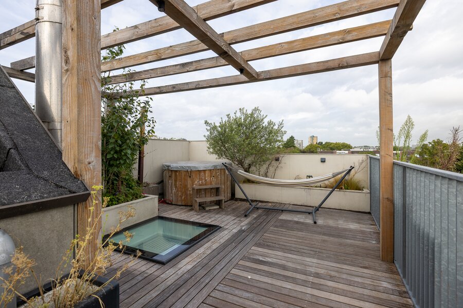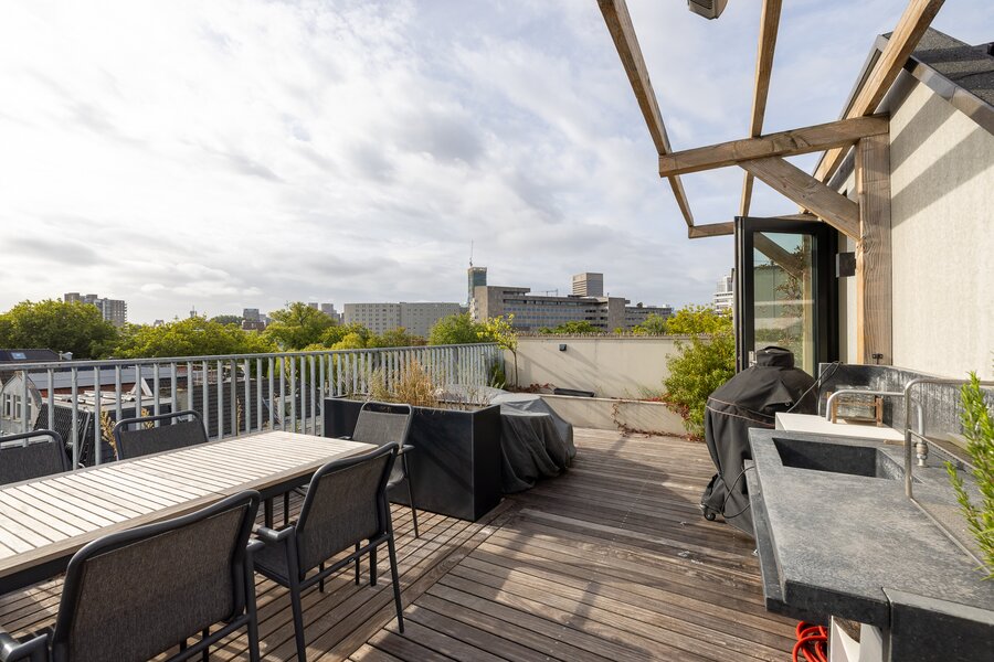 Via vaste trap toegang naar waanzinnig dakterras met uitzicht over heel Rotterdam. Het beschikt over een vaste buitenkeuken opgebouwd uit beton met spoelbak en koelkast. Ook een hot tub is onderdeel van het dakterras!