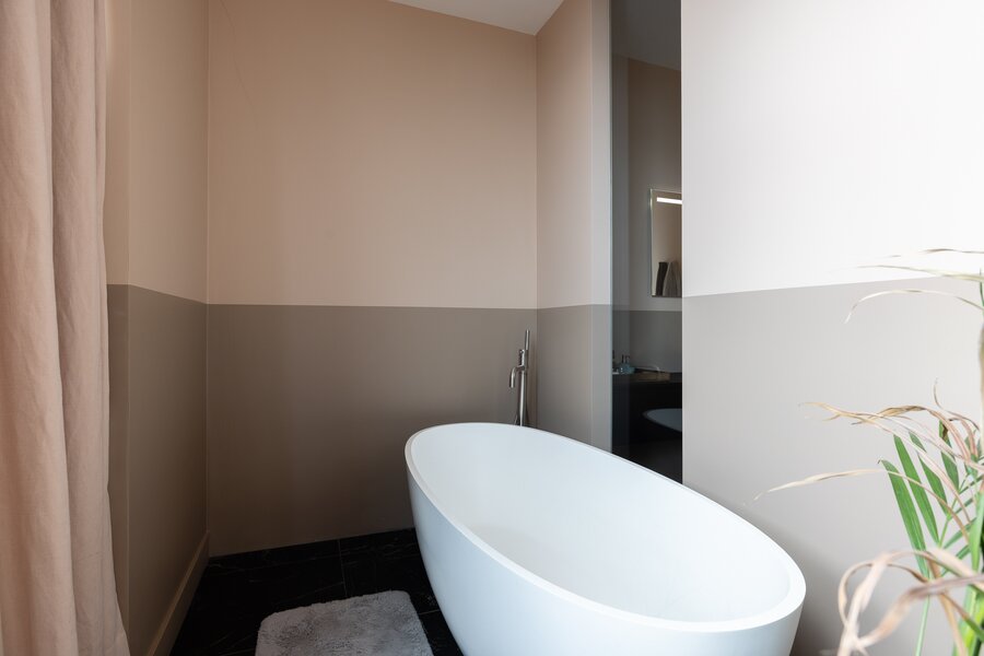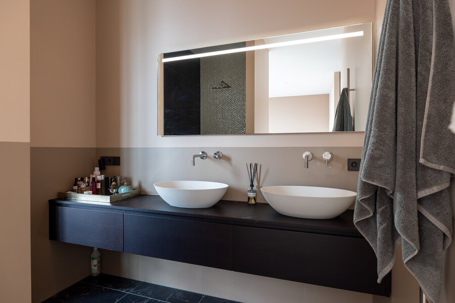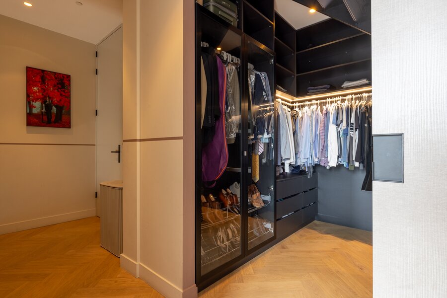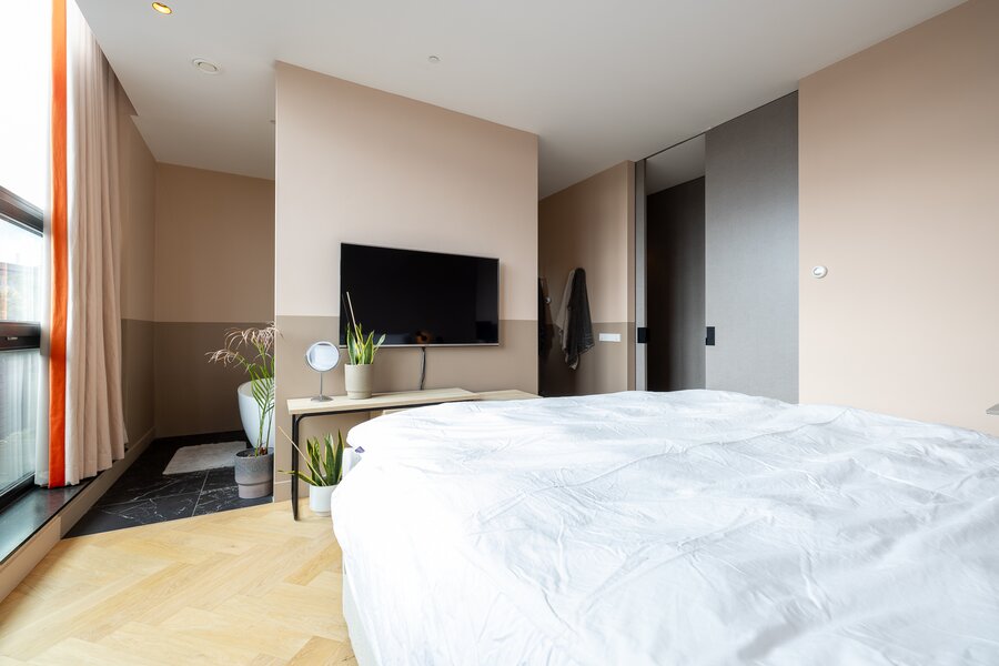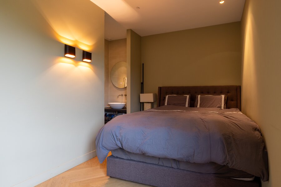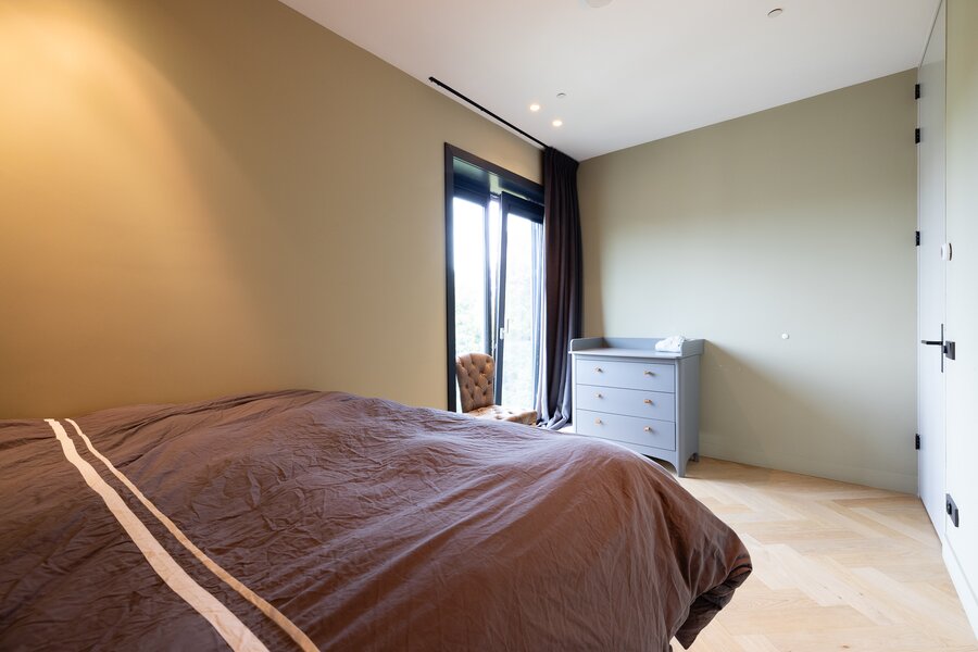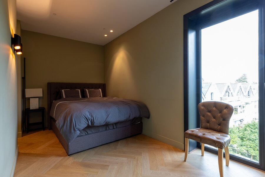 Overloop, bergruimte met opstelling van de warmtepomp en wasmachineaansluiting. De grote hoofdslaapkamer heeft openslaande deuren naar een balkon aan de voorzijde en geeft toegang naar de en suite luxe badkamer voorzien van inloopdouche, dubbele wastafel met meubel en een vrijstaand ligbad. Apart toilet met wandcloset en fontein. Walk-in closet is gesitueerd tegenover de slaapkamer. Extra bergruimte onder de trap. Slaapkamer 2 beschikt over een groot raam tot het plafond en heeft een 2e en suite badkamer voorzien van douche en wastafel.