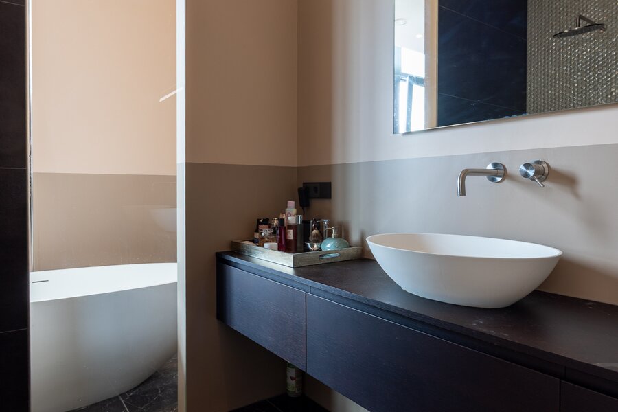 Spectacular roof terrace with amazing view of Rotterdam. There is an outside kitchen made from concrete with washbasin and fridge. A hot tub is also part of the terrace!