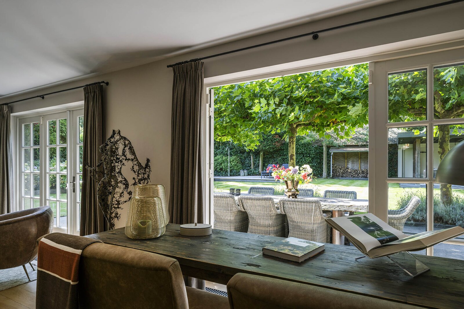 Bij binnenkomst valt direct de royale centrale hal op, met een statig trappenhuis, garderobe en een gastentoilet. Vanuit hier zijn alle vertrekken bereikbaar. De studeer-/TV kamer, voorzien van open haard, grenst aan de woonkamer en kan naar wens open of afgesloten gebruikt worden. De ruime en sfeervolle woonkamer met eikenhouten vloer biedt een prachtig uitzicht op de zonnige tuin. Dubbele openslaande deuren verbinden het binnenleven met het buitenterras, waardoor binnen en buiten naadloos in elkaar overlopen.