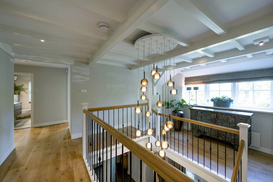 De imposante trapopgang leidt naar een royale overloop met vide, die voor een ruimtelijk effect zorgt. Deze verdieping beschikt over vier slaapkamers, allen voorzien van vaste kasten. De masterbedroom beschikt bovendien over een eigen inloopkast, een tweede kleedruimte en een luxe en-suite badkamer met dubbele wastafel, inloopdouche en toilet. Daarnaast zijn er twee ruime slaapkamers, waarvan één toegang biedt tot het balkon. Een vierde kamer is in gebruik als waskamer maar kan eenvoudig dienstdoen als logeer- of slaapkamer. Voor de kinderen is er een tweede badkamer met inloopdouche, wastafel en toilet.