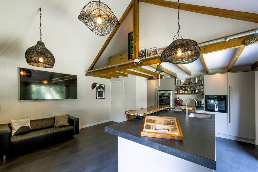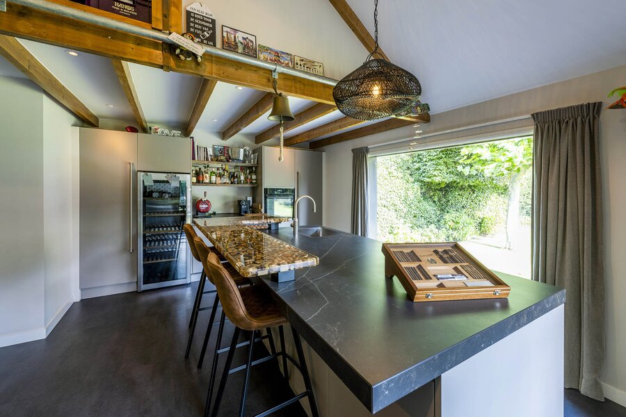 De ruime woon-/eetkeuken, eveneens met openslaande deuren naar het terras en de tuin, vormt het hart van de woning. Deze moderne keuken is voorzien van hoogwaardige inbouwapparatuur en nodigt direct uit tot culinaire avonden met familie en vrienden. Via de centrale hal bereikt u tevens de bijkeuken met veel kastruimte en een praktische zijingang.
