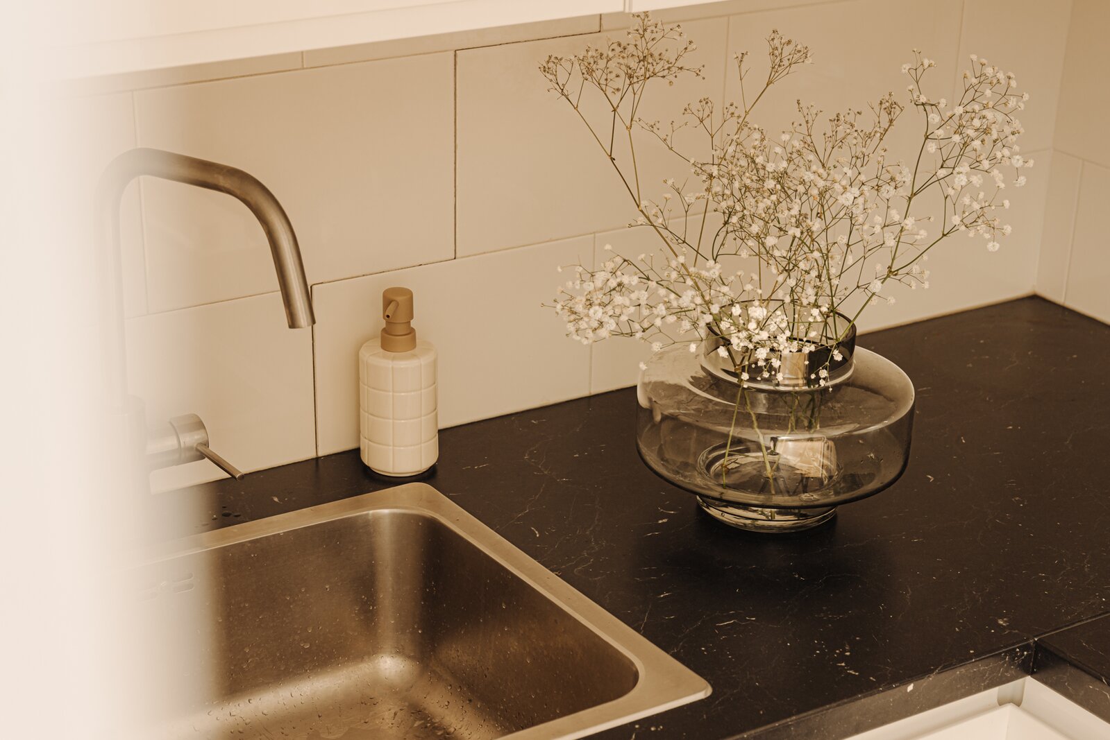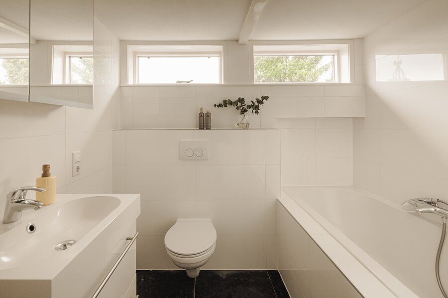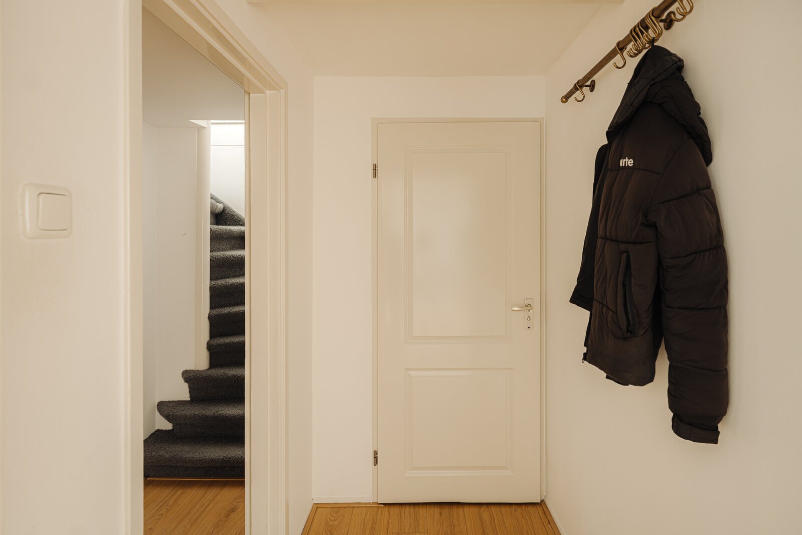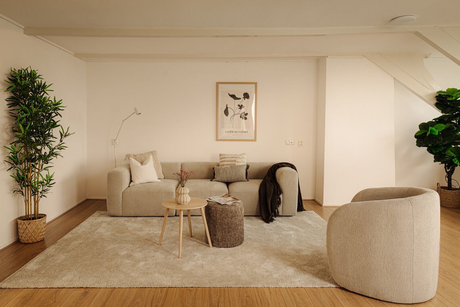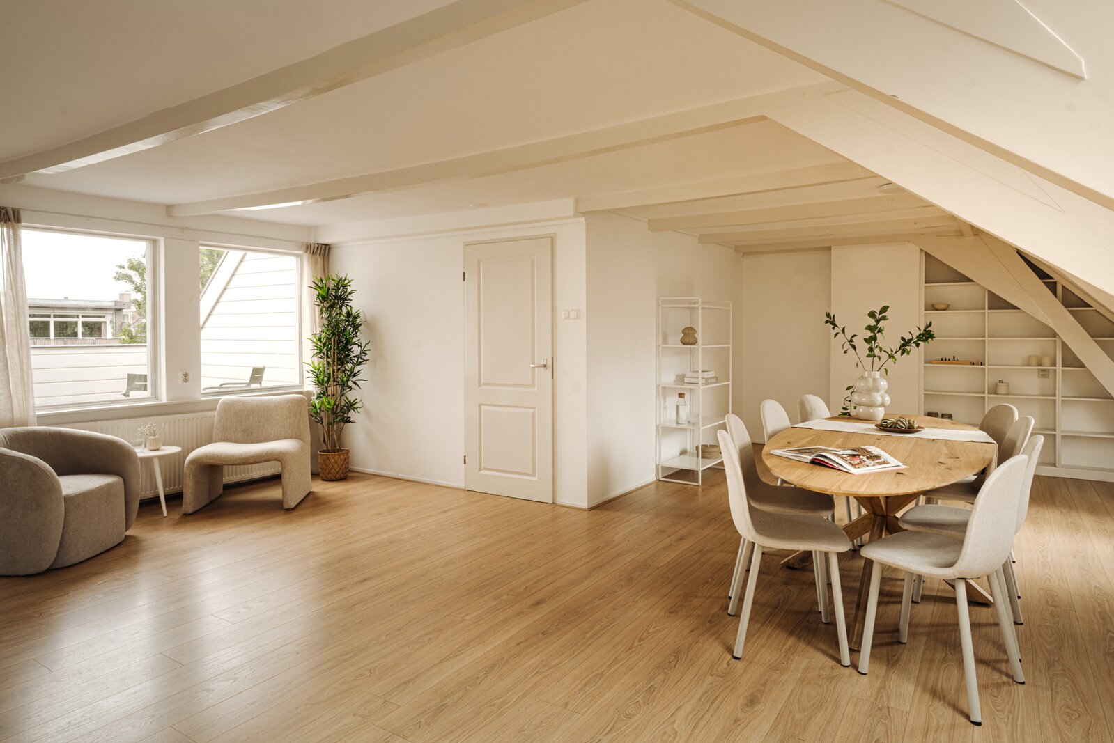 Bij binnenkomst biedt de hal toegang tot een gasten wc, een trap naar de bovenverdieping en de ruime woonkamer. De woonkamer kenmerkt zich door een charmante open balkenconstructie en grote raampartijen die zorgen voor veel natuurlijk licht. Aansluitend bevindt zich de open keuken, voorzien van inbouwapparatuur. Vanuit de keuken toegang tot de bijkeuken met aansluitingen voor een wasmachine en een vaatwasser. Aan de achterzijde van de woonkamer ligt een terras van 9 m².