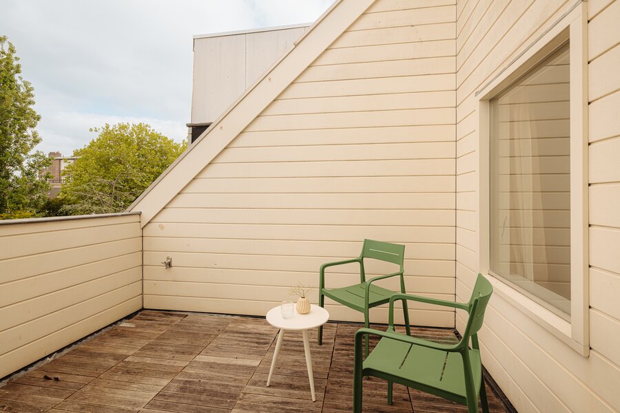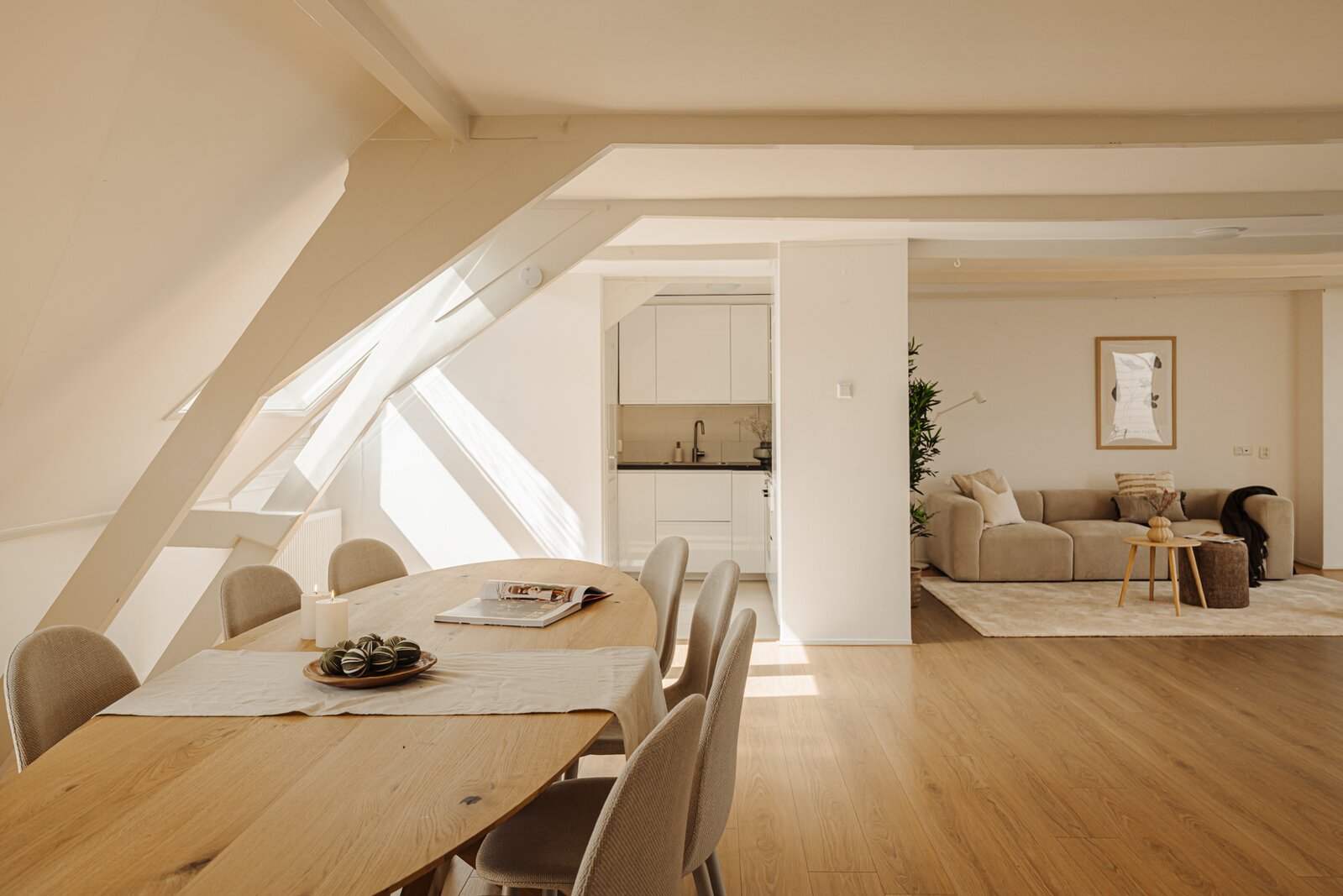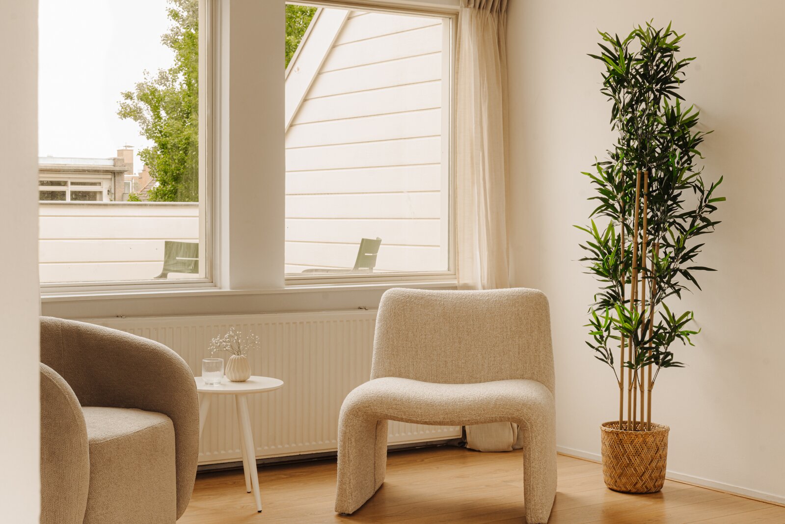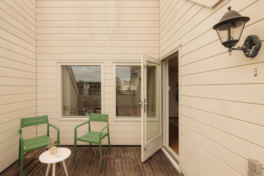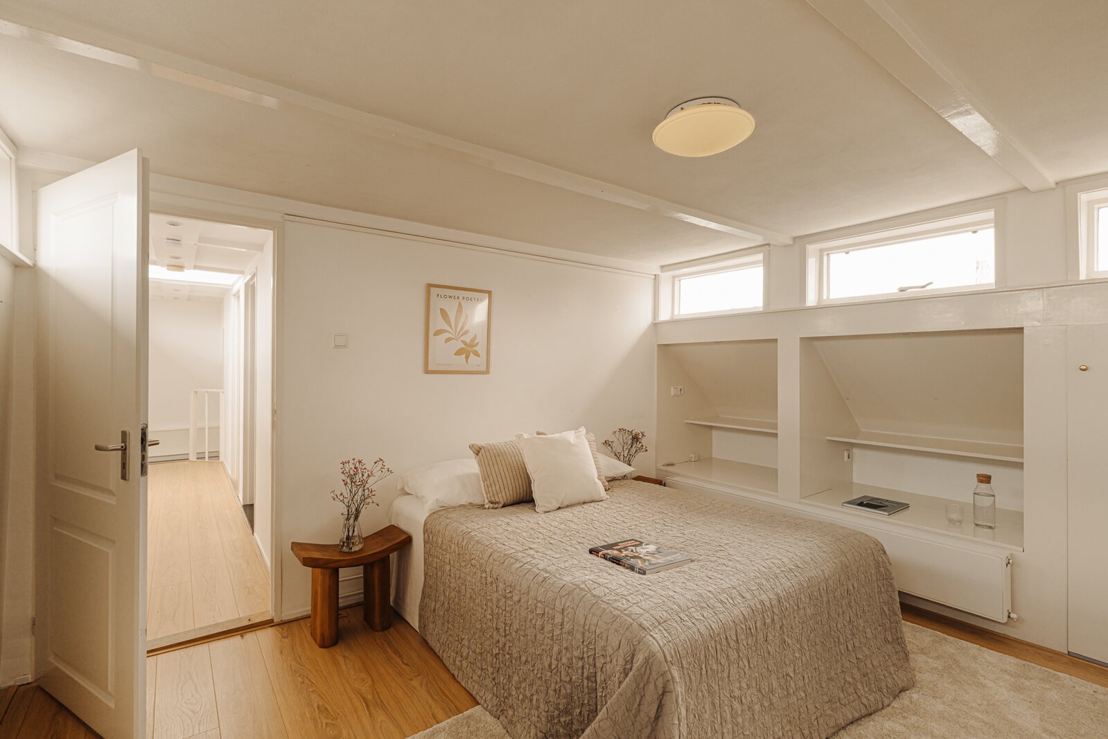 Het appartement heeft een prachtige natuurlijke lichtinval en is verdeeld over twee woonlagen. Het biedt een ruime woonverdieping met open keuken, twee comfortabele slaapkamers, een ruime badkamer, een terras, een gemeenschappelijke tuin en een privéberging. Ondanks de zeer centrale ligging in het hart van Amsterdam, ademt het appartement een sfeer van rust, ruimte en groen.