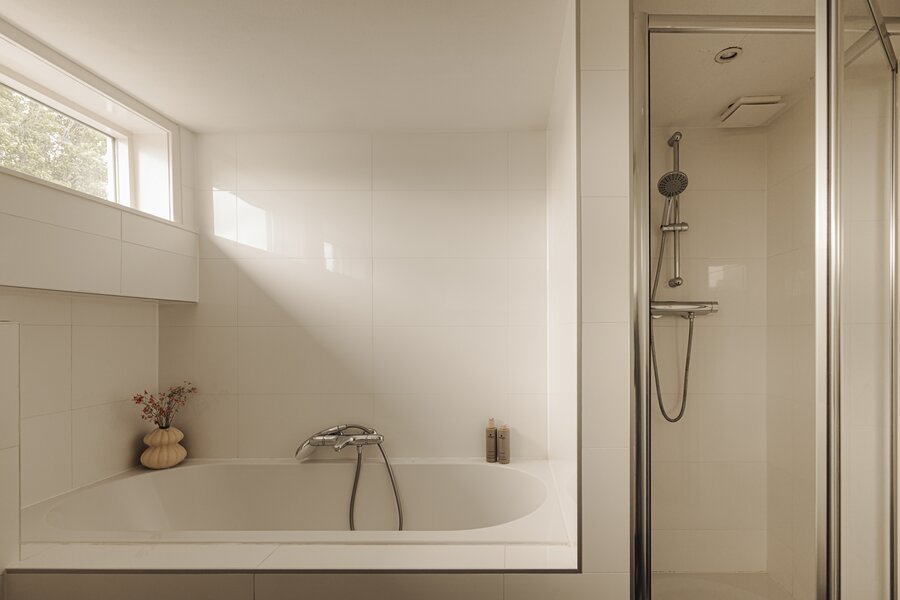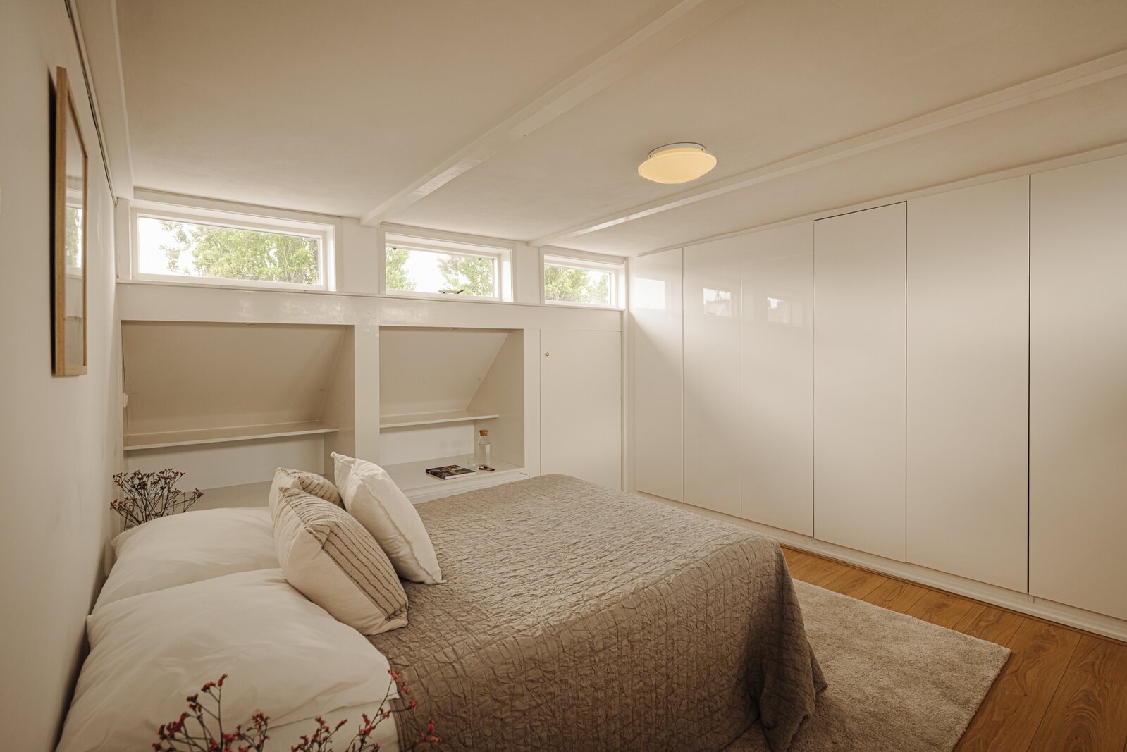 Op de vierde verdieping bevindt zich een lange hal met opbergruimte, twee comfortabele slaapkamers en een badkamer. De badkamer is voorzien van een inloopdouche, ligbad, WC en wastafel.