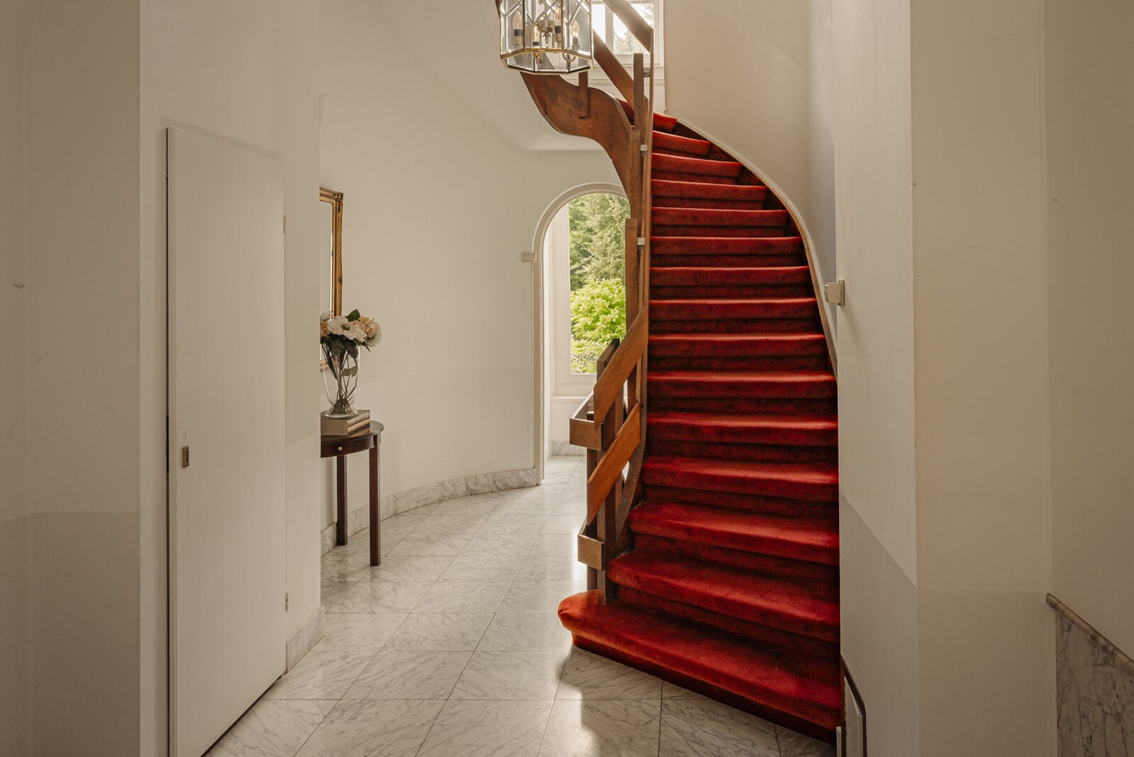 Gemeenschappelijke stijlvolle, lichte marmeren entree met een statige trap die leidt naar de derde verdieping.