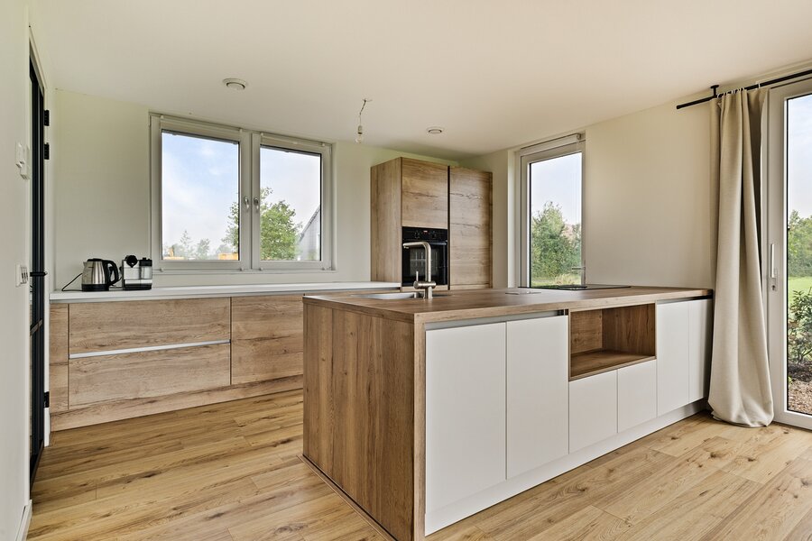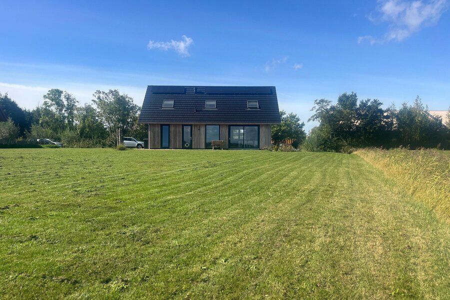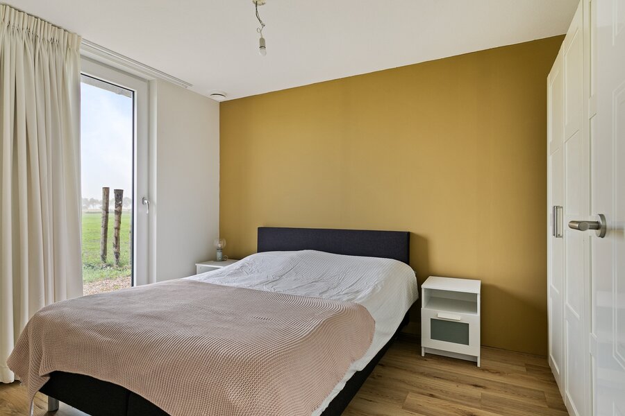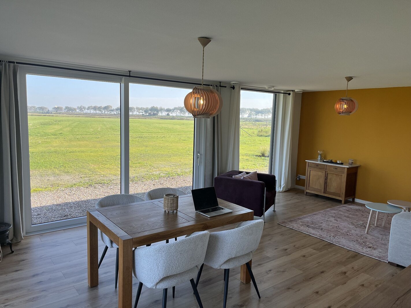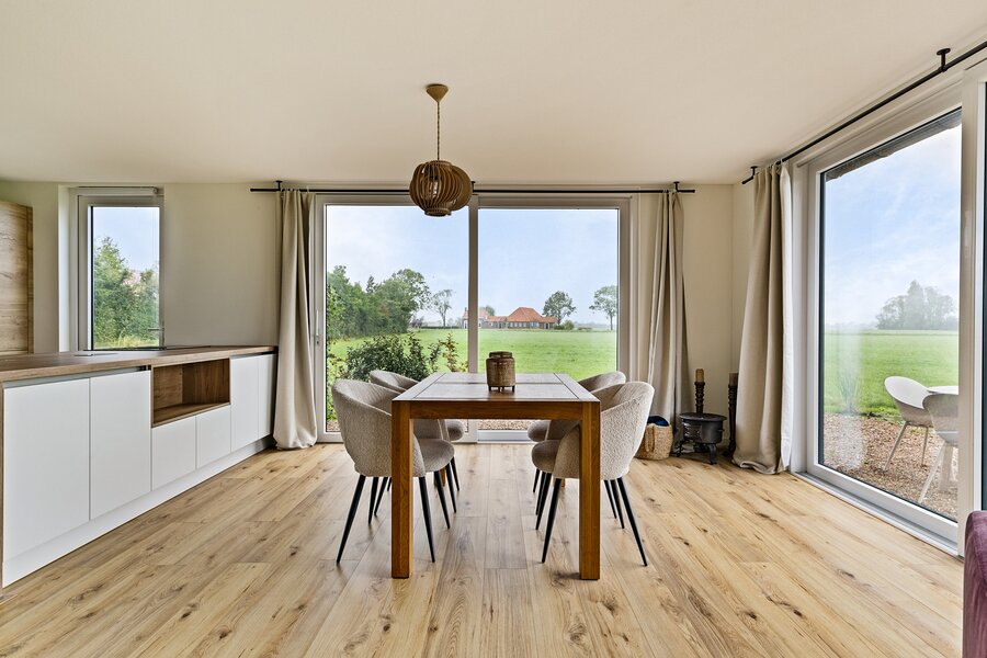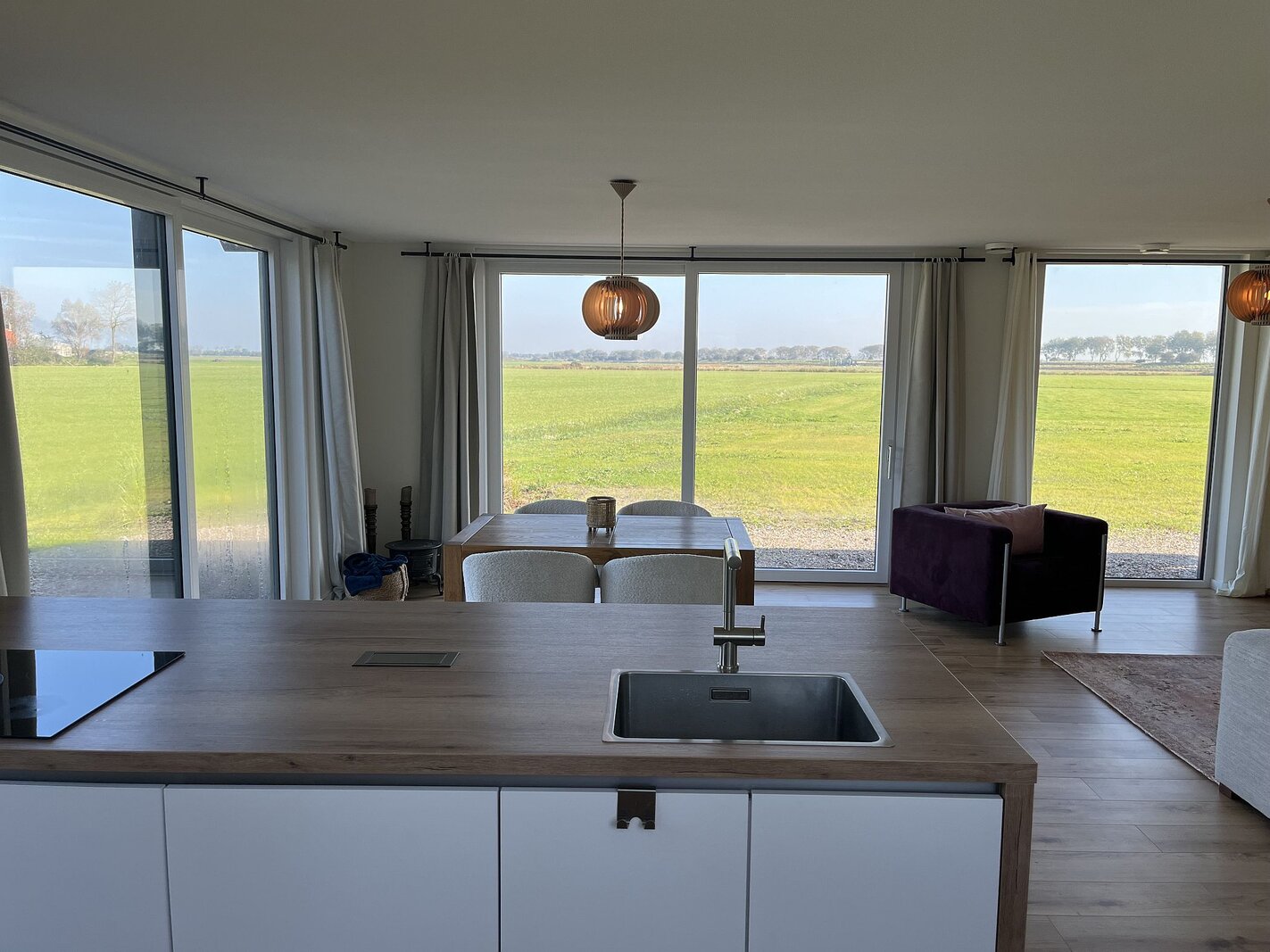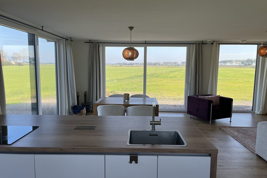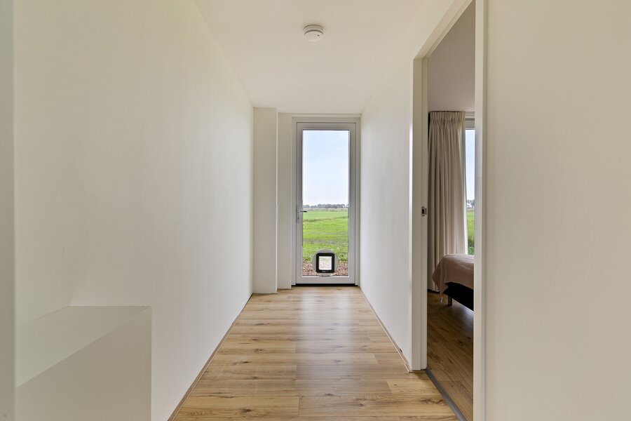 De lichte woonkamer biedt door de mooie grote ramen en schuifpuien prachtige vergezichten over de landerijen en ook koken doe je hier met vrij zicht over het Zeeuwse landschap. De keuken biedt meer dan voldoende werk- en opbergruimte en natuurlijk is er de nodige inbouwapparatuur aanwezig: Bora kookplaat met ingebouwd afzuigsysteem, oven, koel-vriescombinatie en een vaatwasser. Op de begane grond bevindt zich ook een slaapkamer met vrij zicht over de tuin en het weiland. En een ruime badkamer met ligbad, inloopdouche en handdoekradiator en een separaat toilet, wat de woning ideaal maakt voor gelijkvloers wonen.