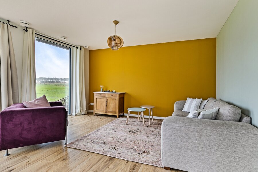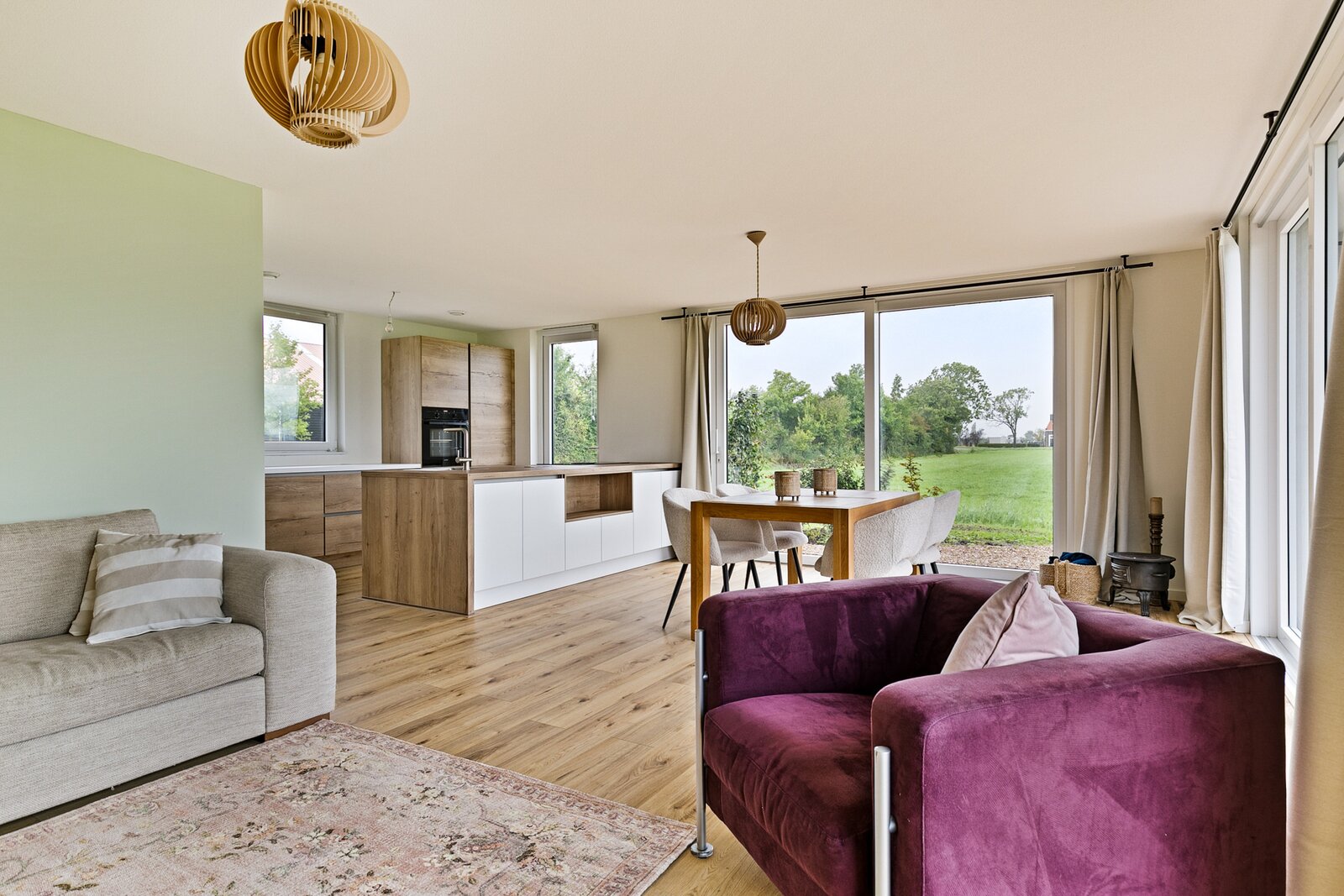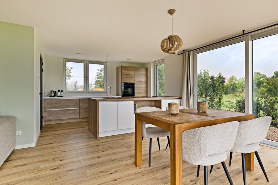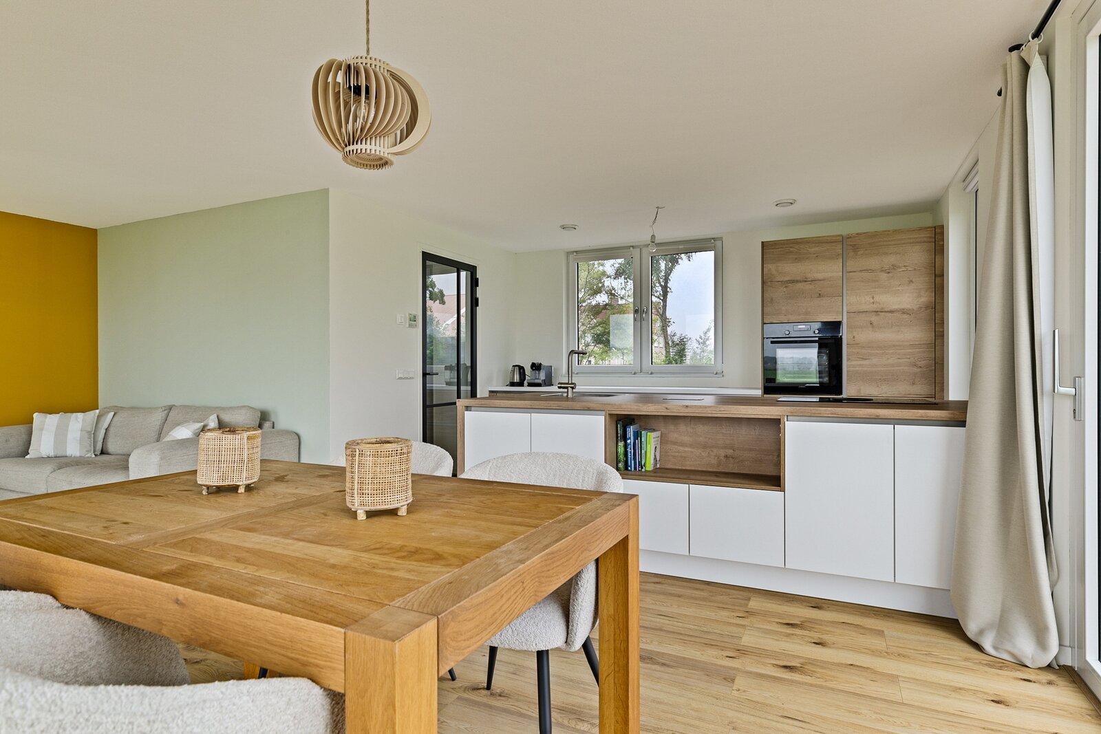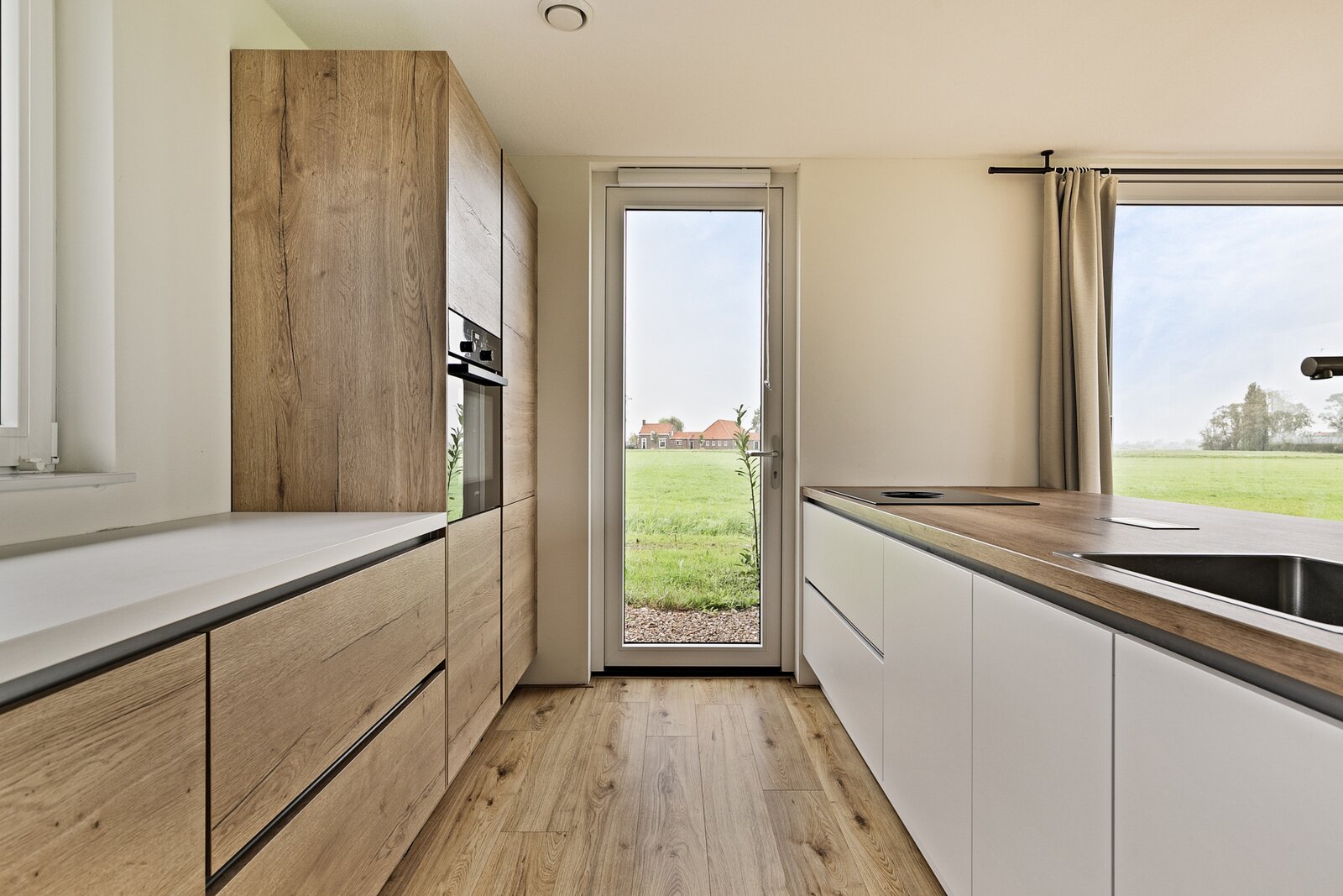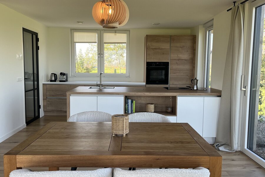 De lichte woonkamer biedt door de mooie grote ramen en schuifpuien prachtige vergezichten over de landerijen en ook koken doe je hier met vrij zicht over het Zeeuwse landschap. De keuken biedt meer dan voldoende werk- en opbergruimte en natuurlijk is er de nodige inbouwapparatuur aanwezig: Bora kookplaat met ingebouwd afzuigsysteem, oven, koel-vriescombinatie en een vaatwasser. Op de begane grond bevindt zich ook een slaapkamer met vrij zicht over de tuin en het weiland. En een ruime badkamer met ligbad, inloopdouche en handdoekradiator en een separaat toilet, wat de woning ideaal maakt voor gelijkvloers wonen.