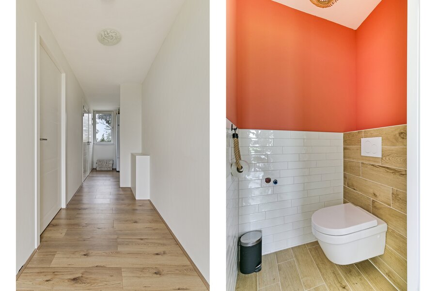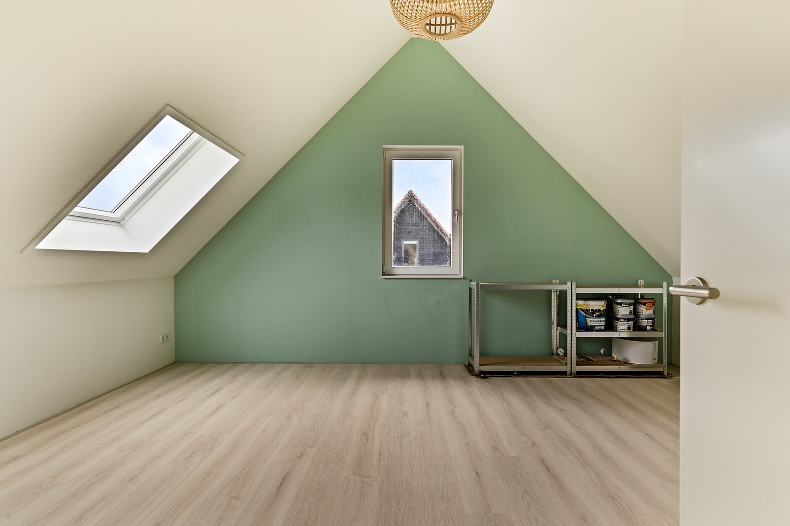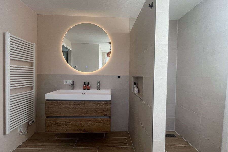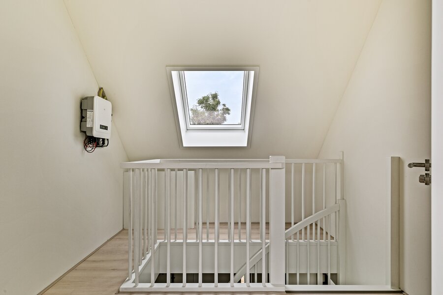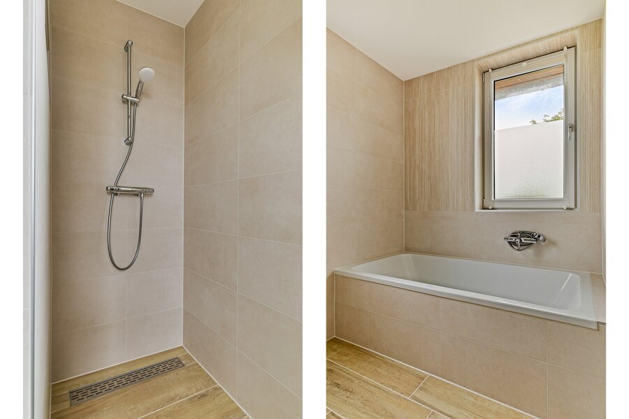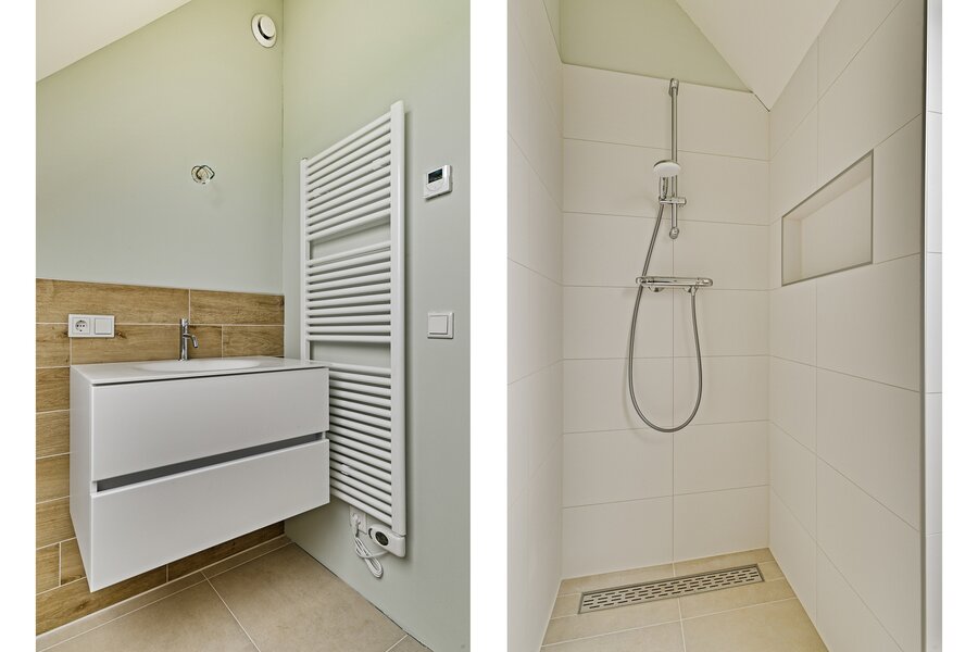Via de trap in de hal kom je op de eerste verdieping, waar twee royale slaapkamers en een tweede badkamer zich bevinden. Deze badkamer is voorzien van een inloopdouche, toilet, wastafel en handdoekradiator.
