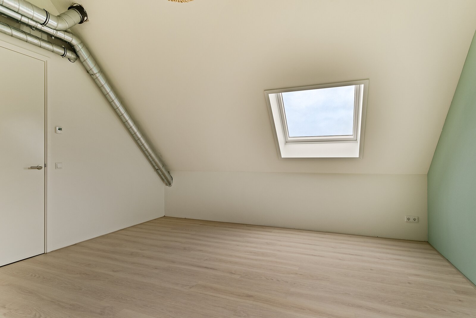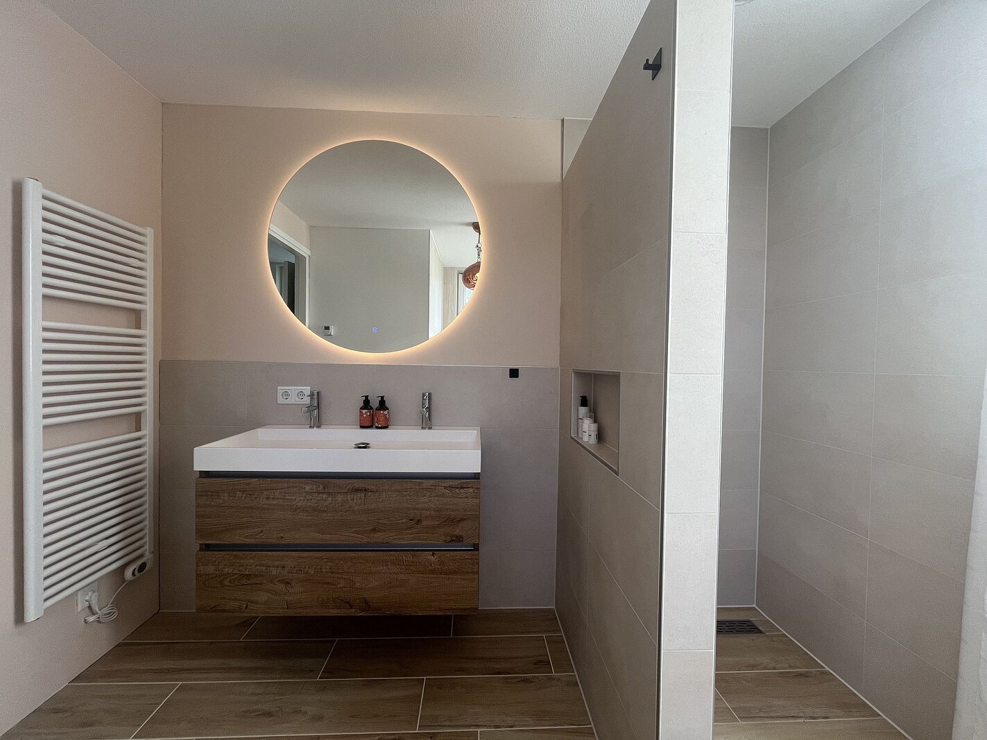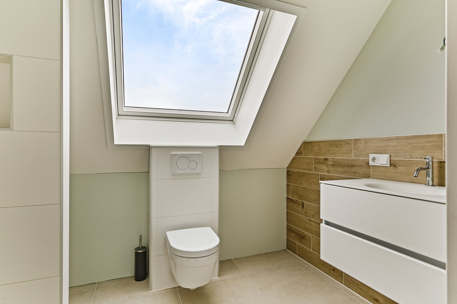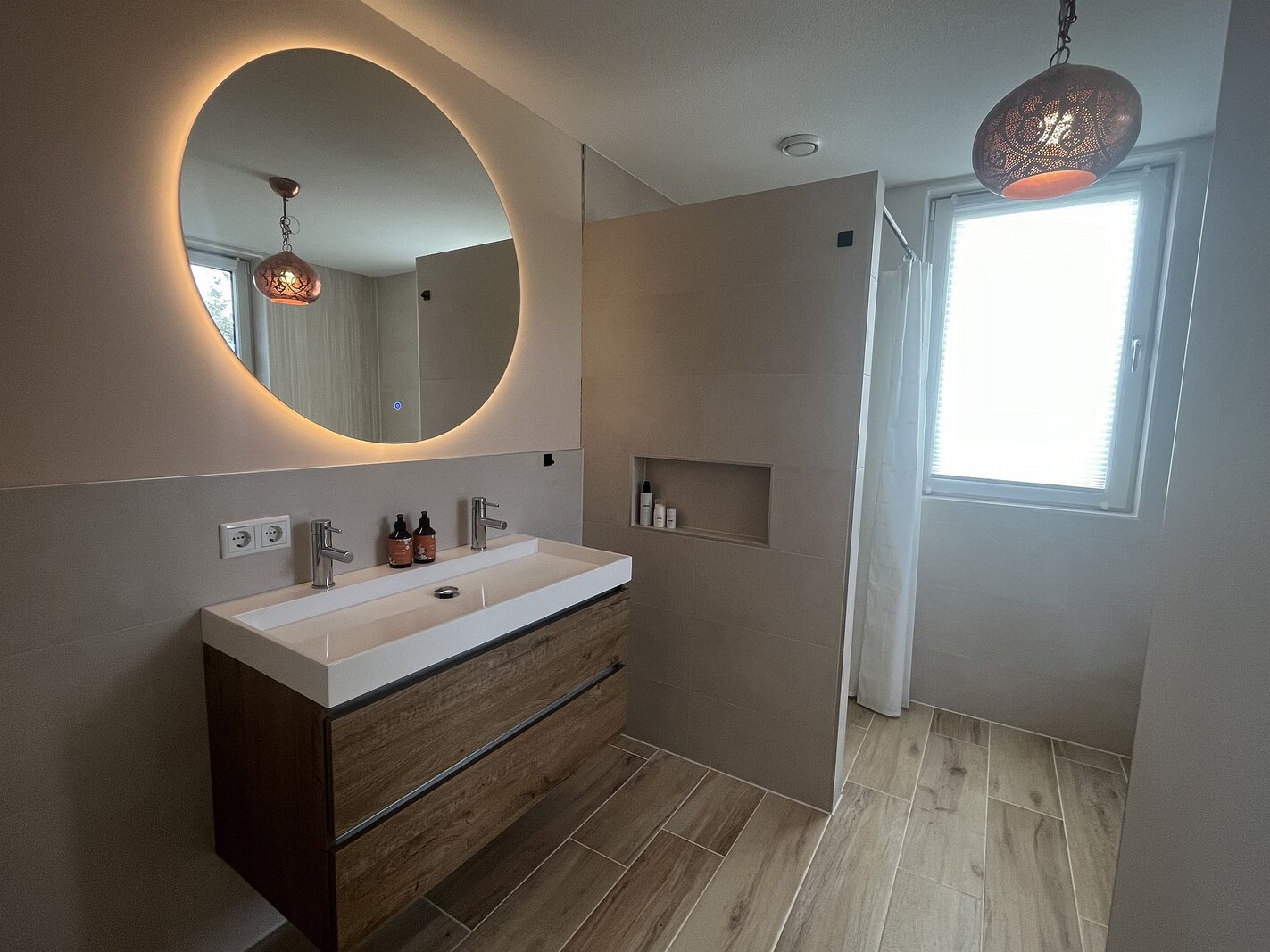 Via de trap in de hal kom je op de eerste verdieping, waar twee royale slaapkamers en een tweede badkamer zich bevinden. Deze badkamer is voorzien van een inloopdouche, toilet, wastafel en handdoekradiator.