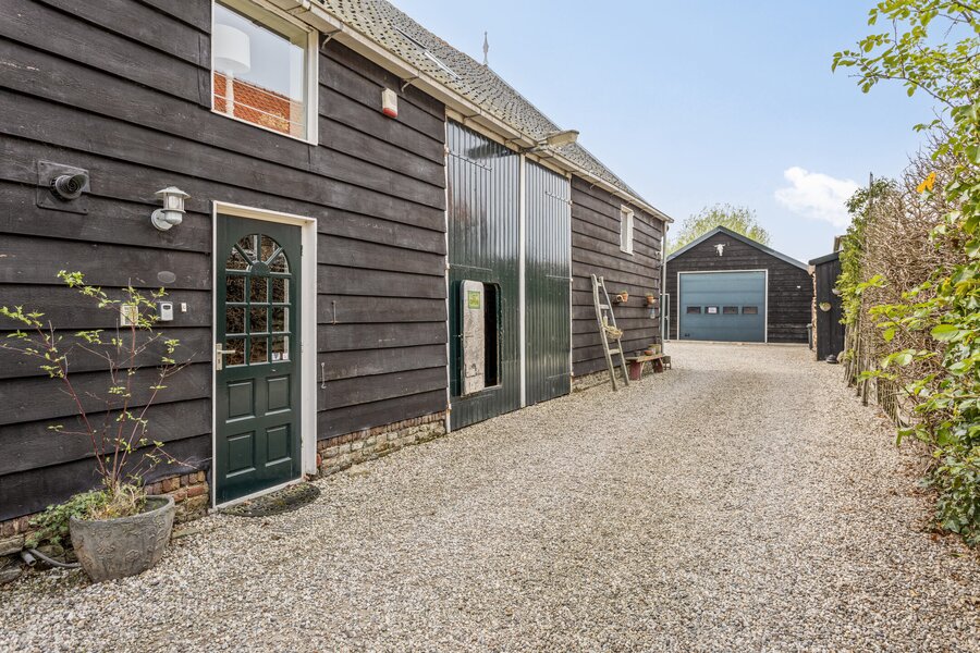 Naast de woning en het appartement zijn er twee schuren aanwezig. Eén daarvan is nog traditioneel in gebruik, de andere is modern en van alle gemakken voorzien – ideaal als werkruimte, hobbyplek of atelier. Buiten vindt u een afwisselend terrein met groen, grind, terrassen en een gezellige veranda. Er is altijd wel een zonnig of juist beschut plekje te vinden om te ontspannen en te genieten van het uitzicht op de omgeving.