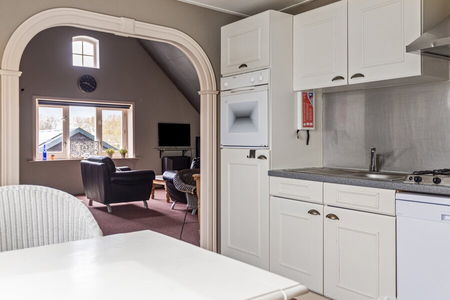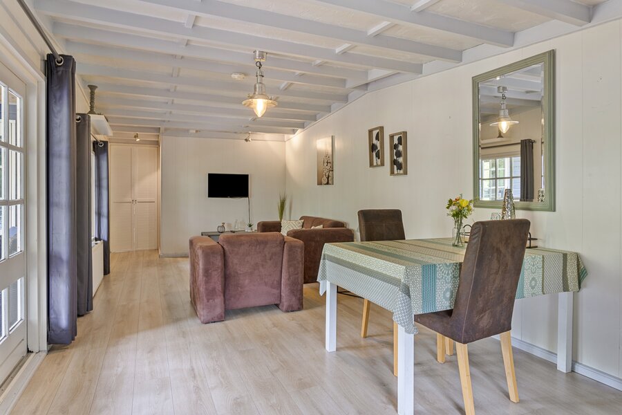 Aan de achterzijde van de schuur bevindt zich een sfeervol 4-persoons appartement, momenteel in gebruik voor recreatieve verhuur. Een mooie bron van extra inkomen!