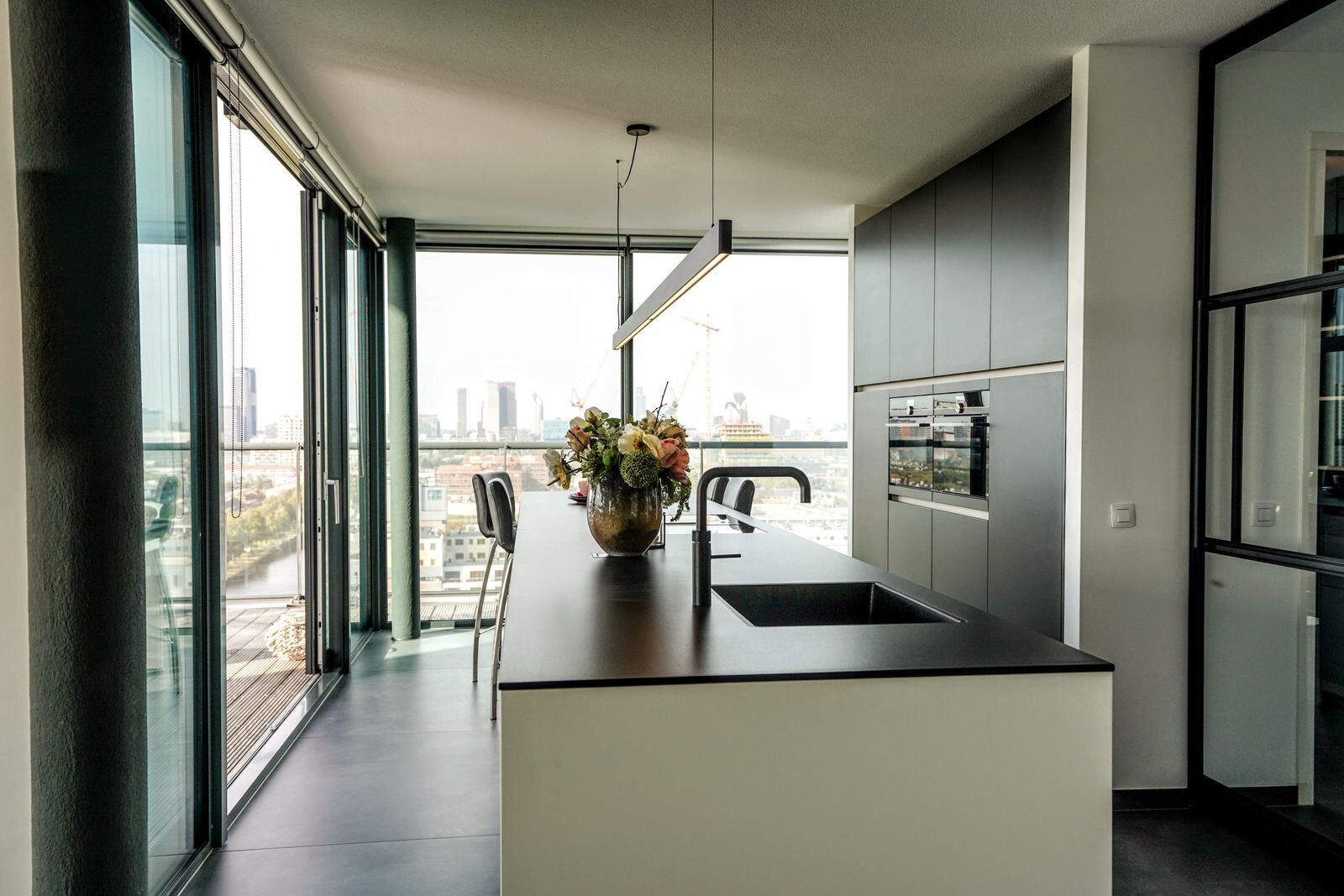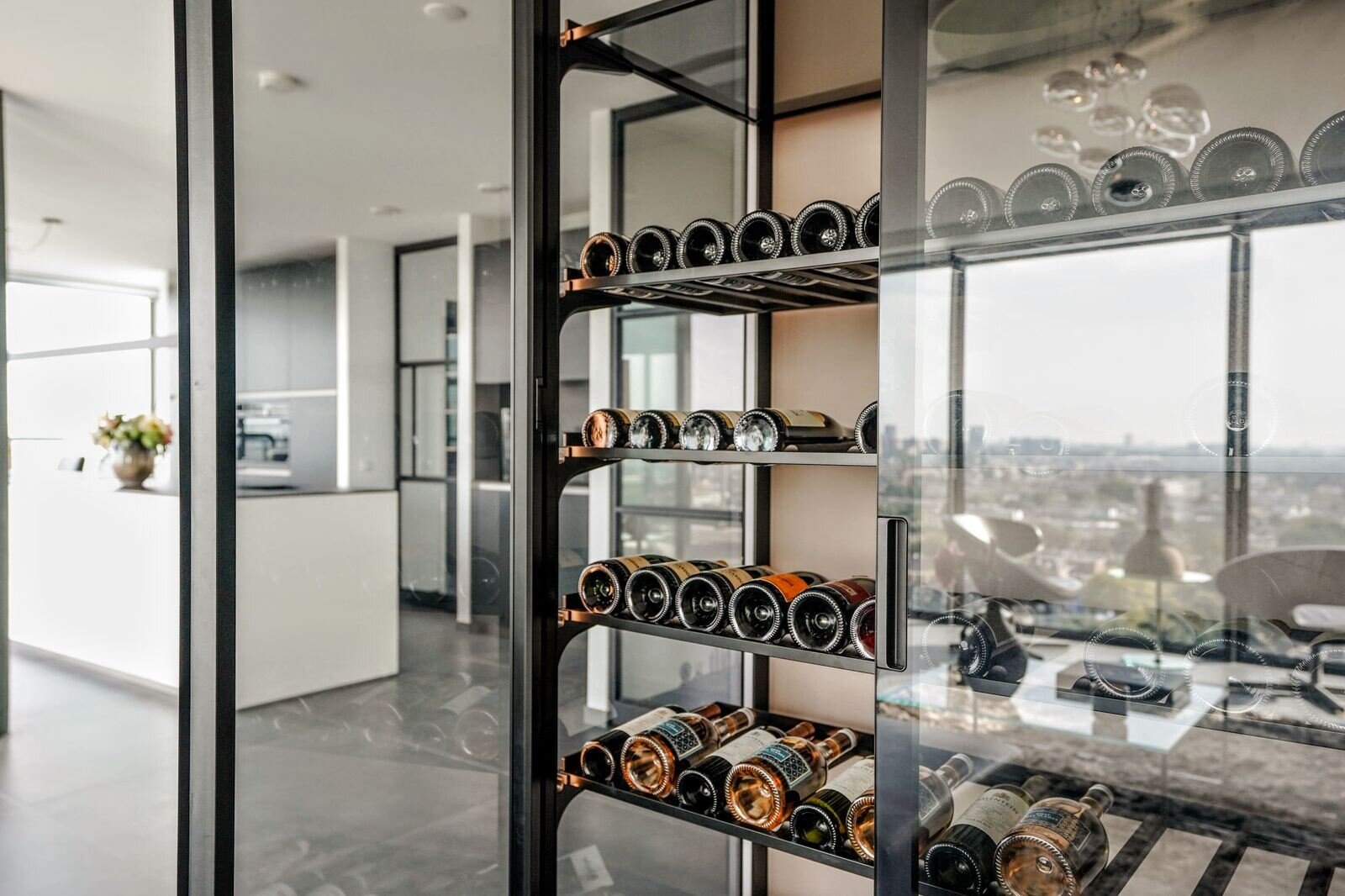 Direct bij binnenkomst word je overdonderd door het fenomenale uitzicht van dit penthouse. De glazen entree met taatsdeuren geeft een gevoel van licht en ruimte. De eye catcher en speciaal ontworpen voor dit penthouse, is de wijnkast van Italiaans design in de woonkamer. De combinatie van zwart getint glas en subtiele verlichting, geeft een strakke maar ook warme uitstraling.