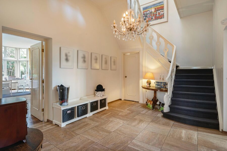 Betreed deze prachtige woning via de overkapping of aangrenzende berging, naar de vestibule die leidt naar de ruime entreehal. De hal, gekenmerkt door een statige bordestrap en een ruime garderobe met twee afzonderlijke toiletruimtes, vormt een indrukwekkend welkom. Vanuit de hal is er toegang tot meerdere vertrekken.