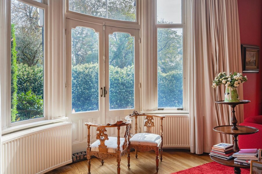 - Mogelijkheid om de aankoop te combineren met het achtergelegen koetshuis (Violenweg 5A) – gezamenlijke koopprijs € 4.250.000 k.k. en perceeloppervlak ca. 1.672 m²