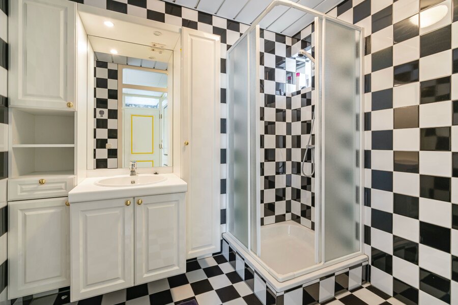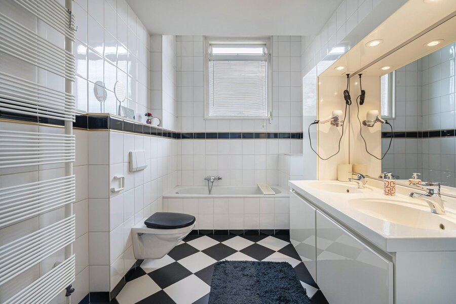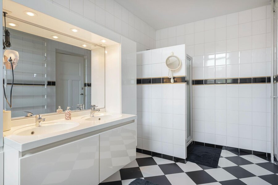 De vierde slaapkamer (master) beschikt over een eigen ruime badkamer met douche, dubbele wastafel, toilet en ligbad. Ook deze kamer biedt toegang tot het balkon.